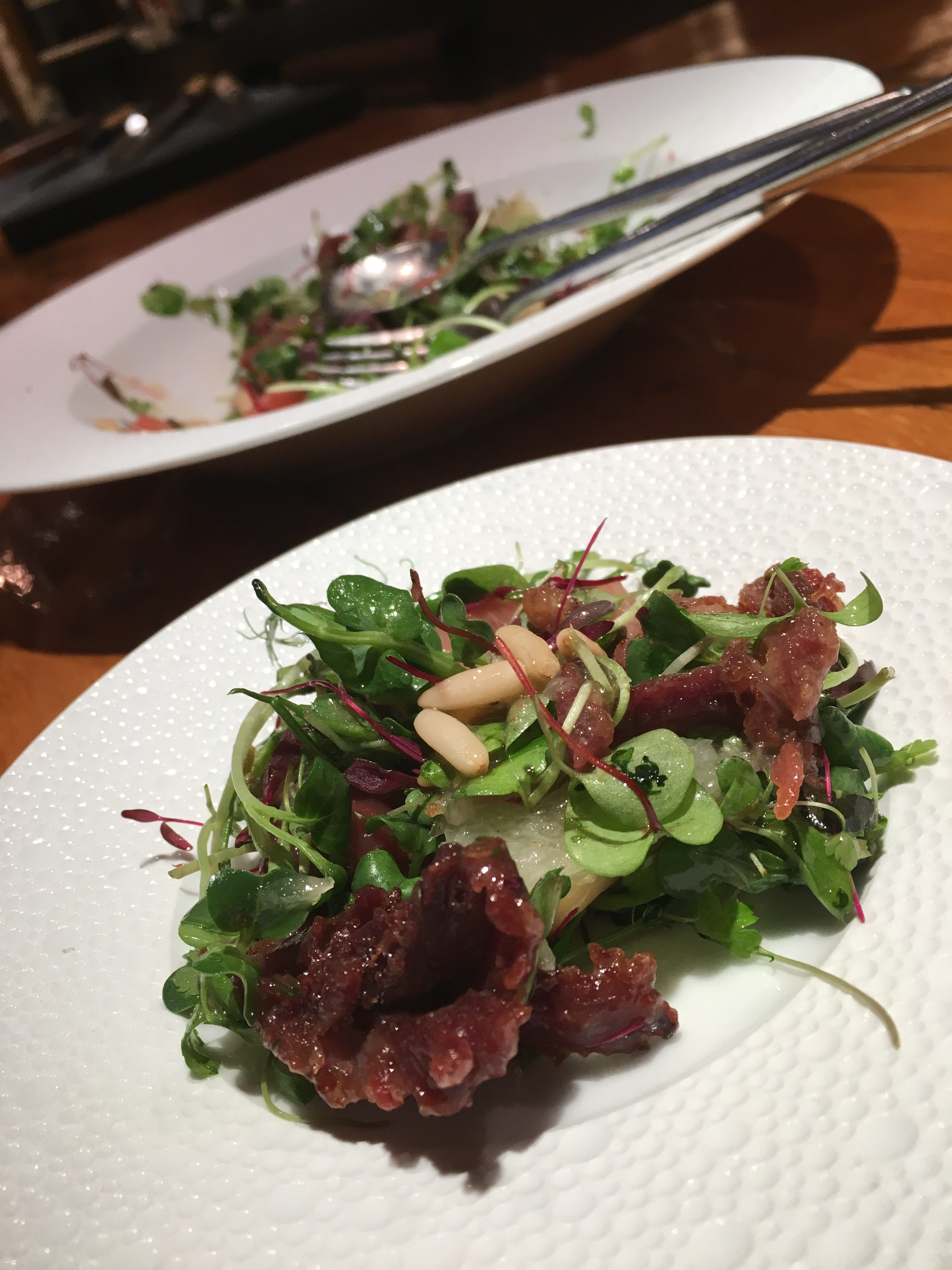 Vervolgens zien we de chef iets – achteraf gezien eend – frituren en daarbovenop een heuse toren van een delicate sla leggen om uiteindelijk de crispy duck salade | eend • pompelmoes • pijnboompitten voor onze ogen door elkaar te husselen. Wederom bingo, of noem het een culinaire hat-trick. Er volgen nog drie rondjes, dus wat mij betreft mag dat gerust een dubbele worden…