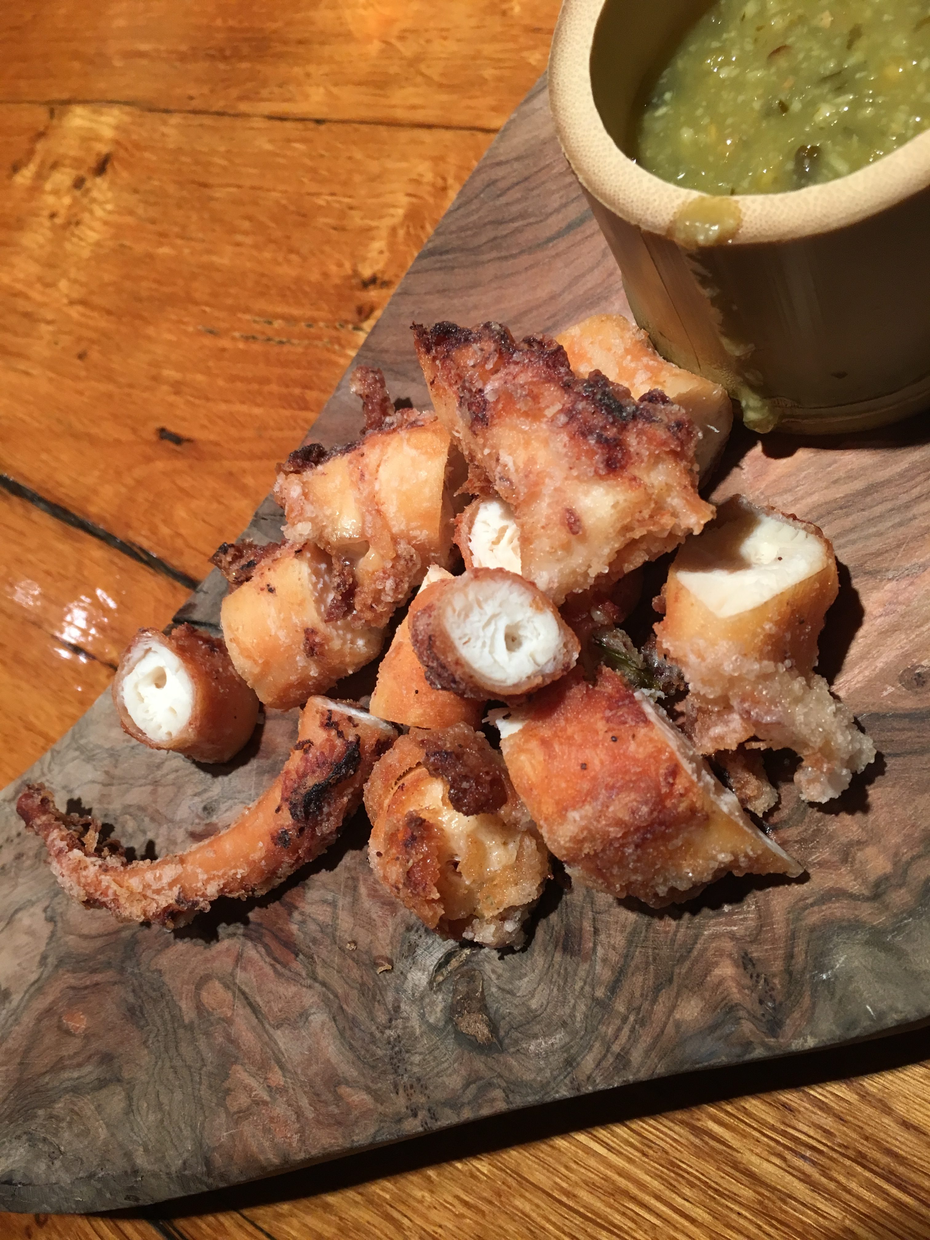 Wat een fijne gedacht dat je het volste vertrouwen kan hebben in een chef, zelfs bij een eerste kennismaking! Voor de vierde gang doet hij er nog een schepje bovenop: op een beeldige plank van olijfhout intrigeert de octopus • groene chili. Ik ben niet zeker hoe de octopus bereid werd… Een gokje: gefrituurd met een soort tempurabeslag rond en vervolgens in de oven verder gegaard of zo. Ernaast staat trouwens een kommetje uit bamboehout met een dip van groene chili. Wat een bommetje!