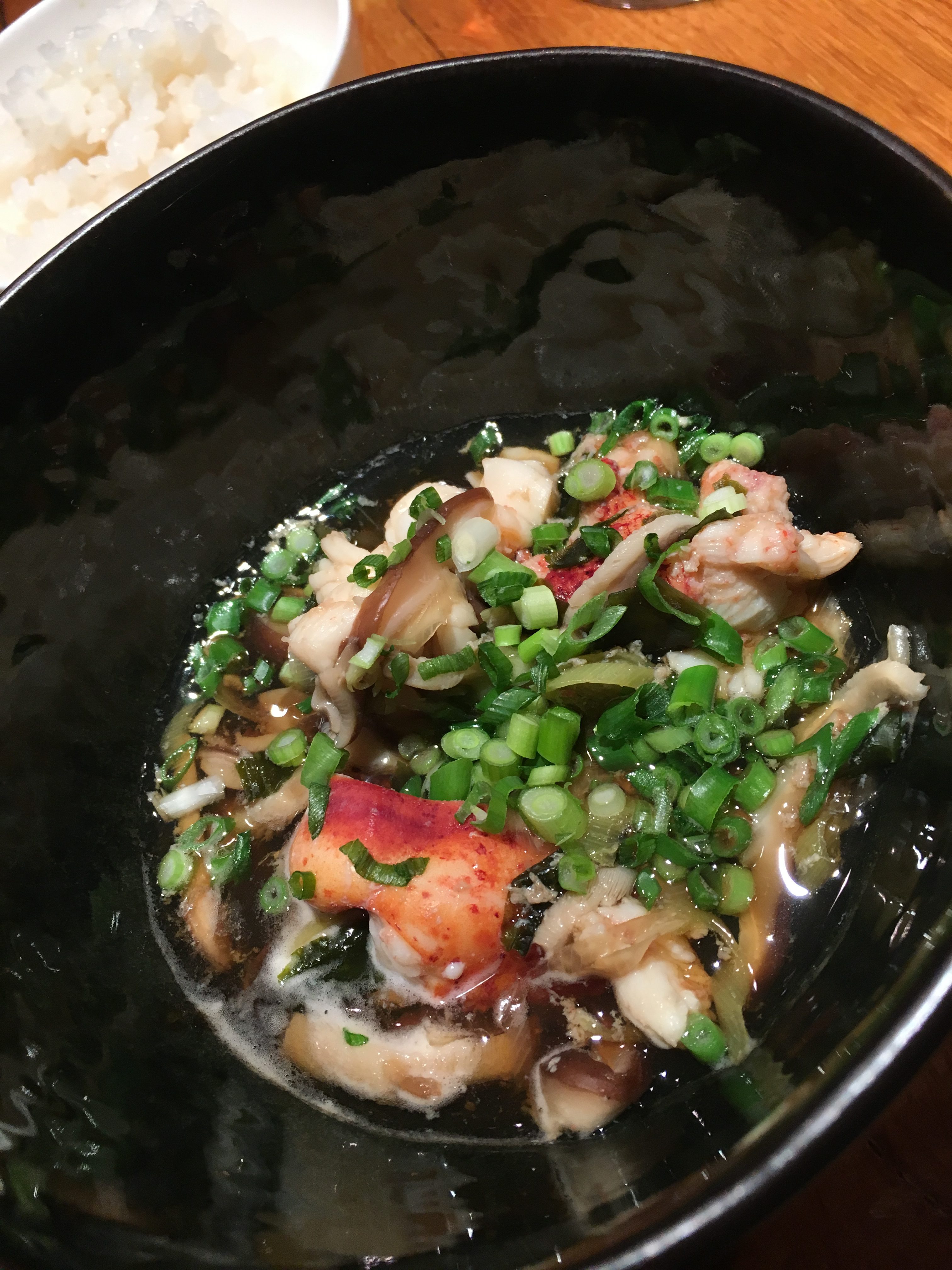 Als voorlaatste zaligheid mogen we een bowl met dashi • shiitake • kreeft leeglepelen, een gepaste milde bouillon om geleidelijk aan af te ronden.