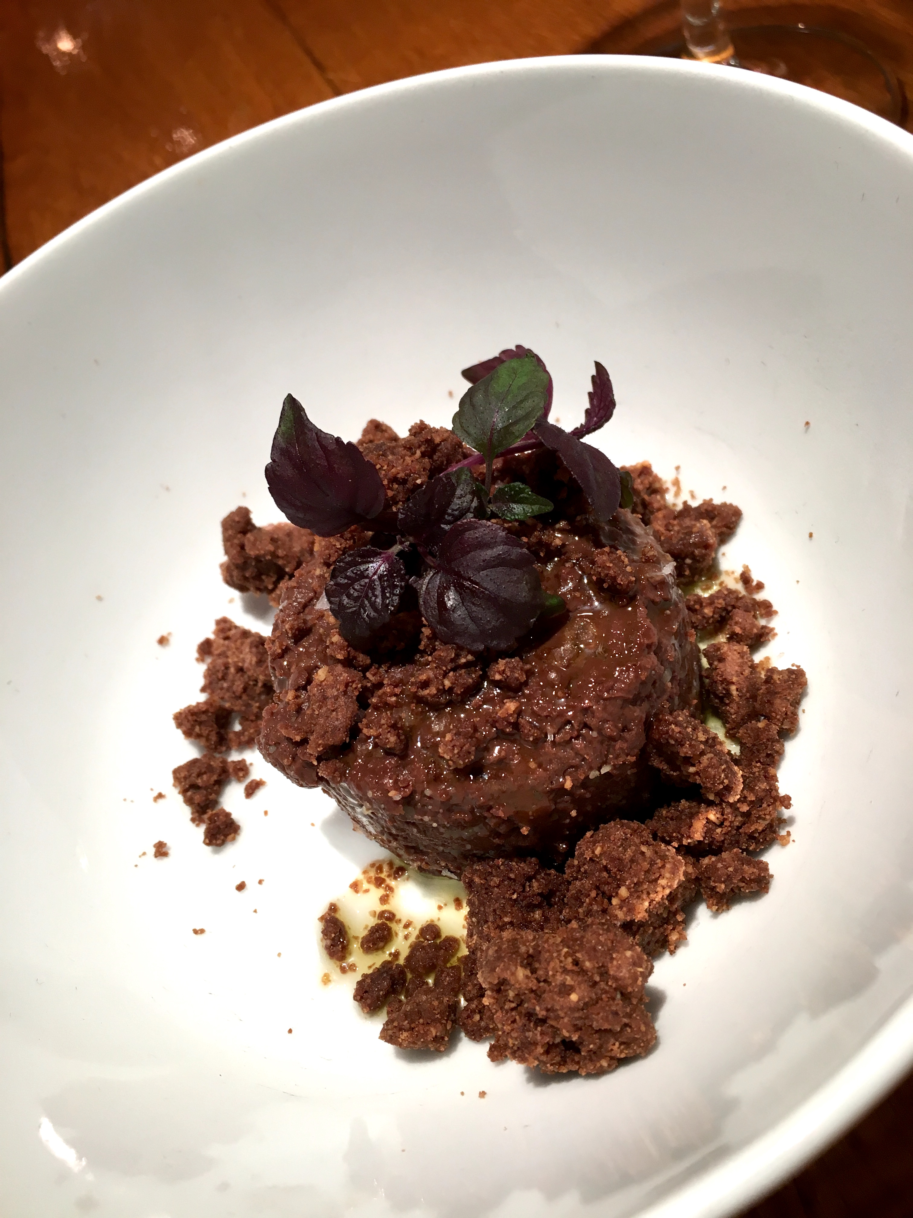 Hoewel ik – en nu herhaal ik mezelf – geen dessertmens ben, kijk ik toch uit naar welk Japans hedendaags nagerecht met westerse knipoog we zullen mogen proeven. Even denk ik aan sesamijs, maar het wordt chocolade • red shiso • olijfolie • zeezout. De combinatie van chocolade met olijfolie en zeezout proefde ik al eerder en het verwondert me telkens weer hoe goed deze ingrediënten samengaan.