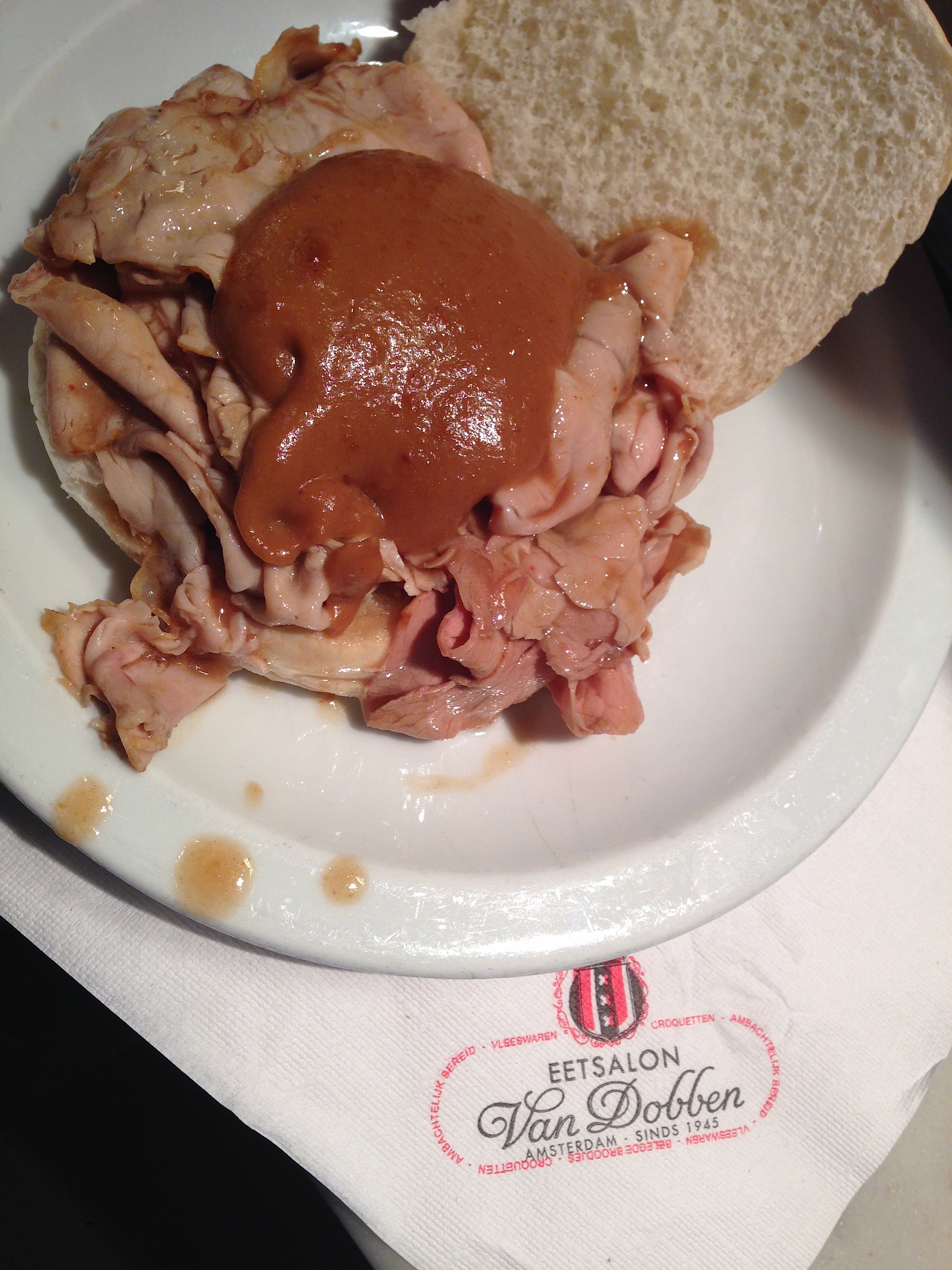 Net zoals bij het exterieur ben ik er niet in geslaagd om blogwaardige foto’s te nemen van mijn broodjes. In de eerste plaats dus het klassieke broodje croquet. Opvallend is dat mevrouw Van Dobben de kroket voor mijn ogen halveert en zo op de beide broodhelften drukt. De mosterd leen ik van mijn buurman. Mmmmm, dit was té lang geleden…
