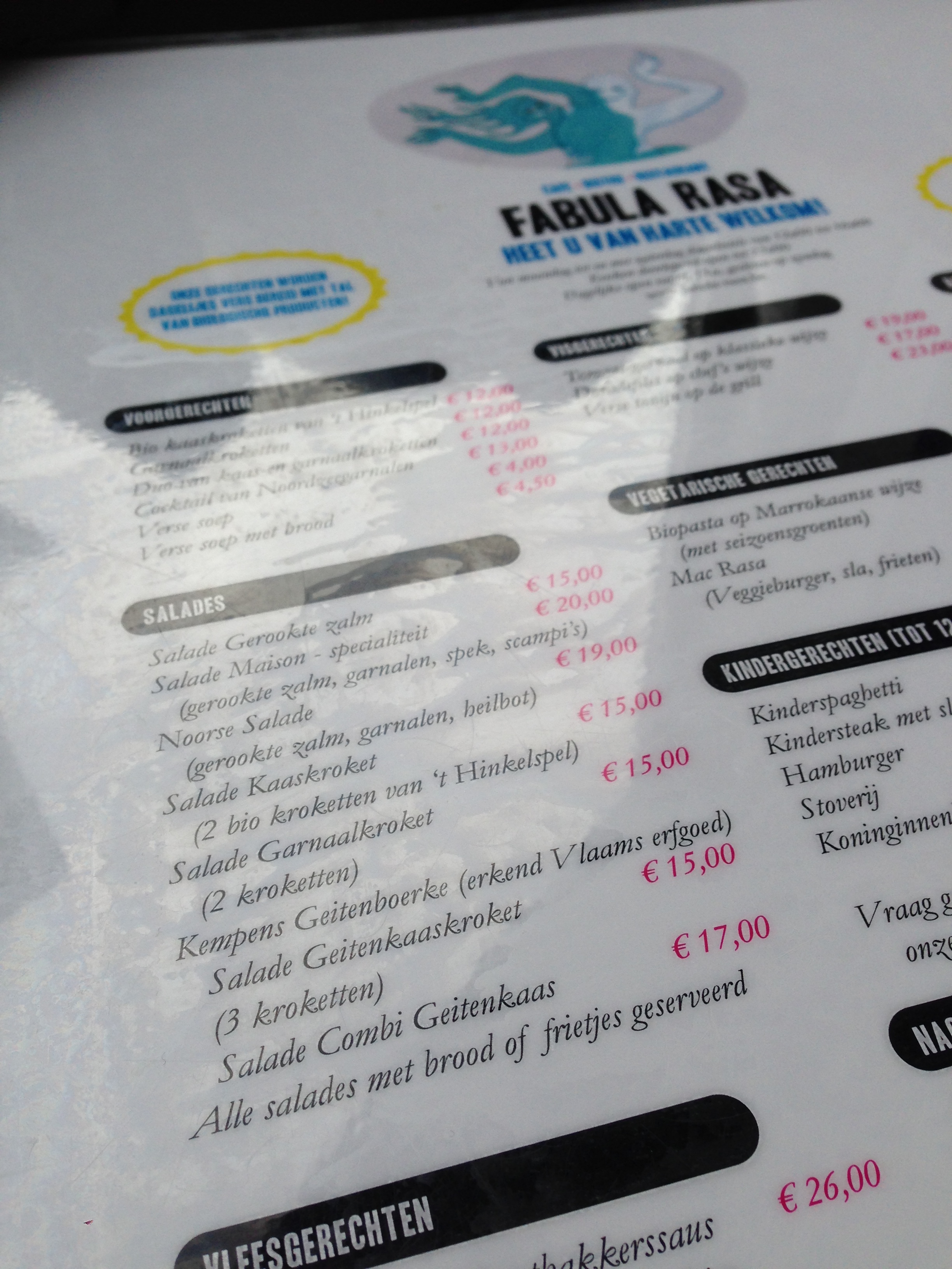 Ik wandel iets na het middaguur binnen en krijg de keuze tussen meeschuiven aan de lange tafel in het eerste deel of een tweepersoonstafeltje in de achterkamer. Wegens absoluut geen behoefte aan sociaal contact installeer ik mij achteraan. Qua eetkeuze hoop ik het vooral licht te houden. De kaart spreidt zich uit: slaatjes, vlees, vis, pasta’s en een vrij vol suggestiebord. Mijn blik blijft even hangen bij de Mac Fabula (hamburger + friet), maar mijn eetgeweten stuwt mij richting slaatjes. Voor mij de salade garnaalkroket (met 2 stuks – € 15,00) graag! Ik zou nu qua leugentje om bestwil kunnen beweren dat ik het zinnetje ‘Alle salades met brood of frietjes geserveerd’ niet gelezen heb. Dat is echter niet helemaal of eigenlijk helemaal niet waar. Desalniettemin troost ik mezelf dat ik niet specifiek uitsproken heb dat ik frietjes wil. Misschien brengen ze wel by default brood…