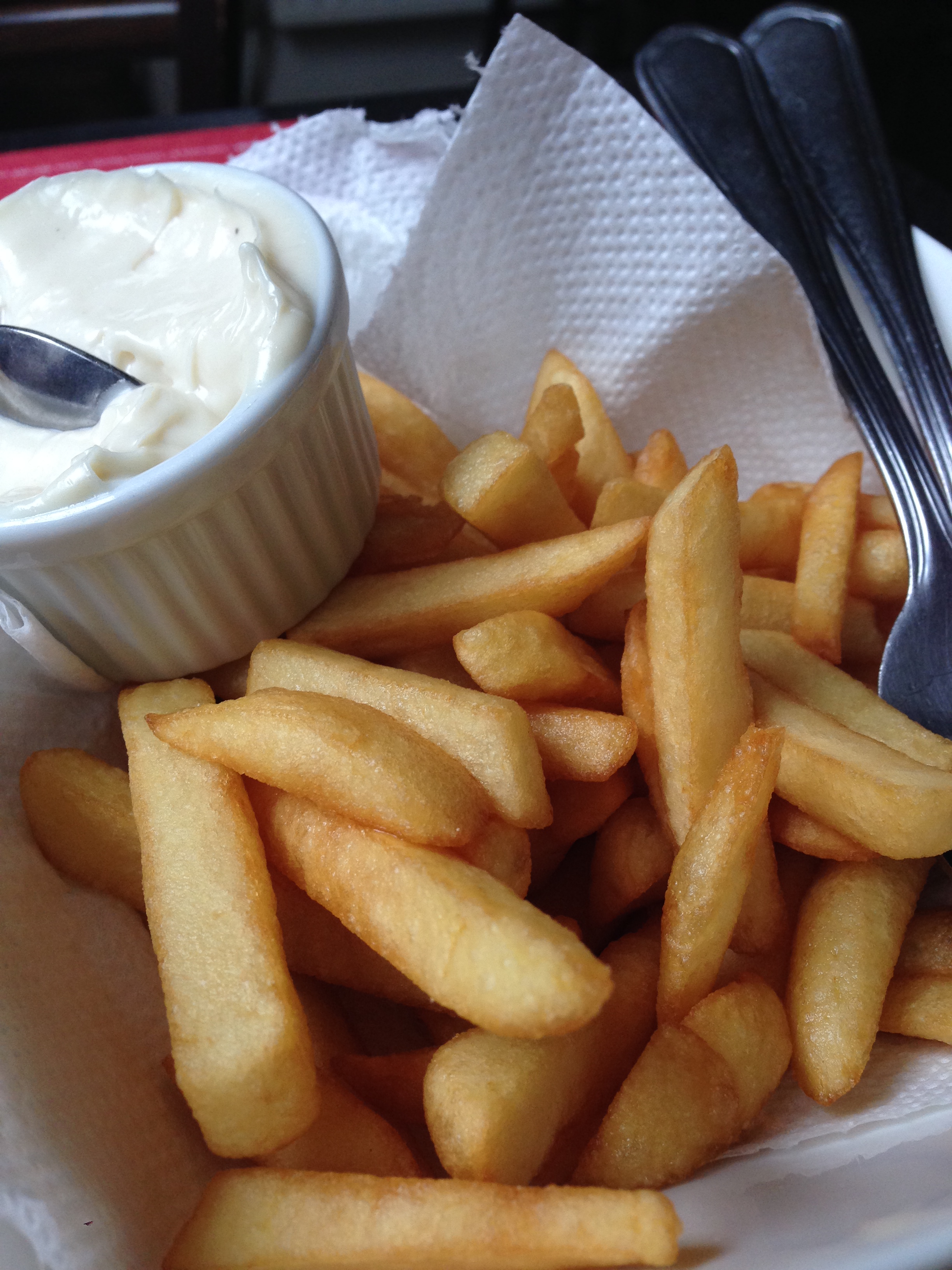 Mijn gigabord verschijnt en meteen besef ik dat mijn definitie van een lichte lunch niet helemaal overeenstemt met die van Fabula Rasa. Bovendien blijkt dat ze die verborgen zonden van hun klanten goed inschatten en sowieso frietjes serveren. Een serieuze portie goudgebakken Belgische trots met huisgemaakte mayonaise trouwens.