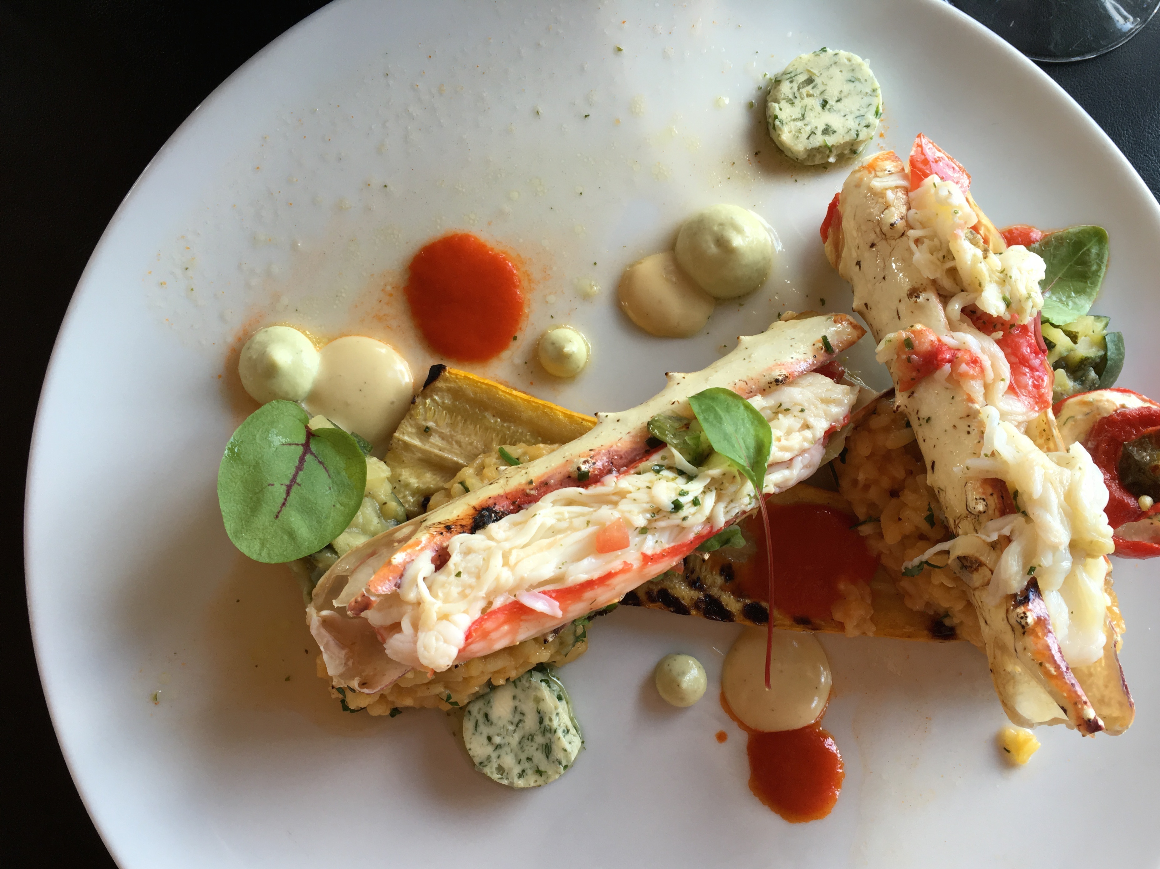Mijn suggestiebord met king krab maakt eender welke eerdere opmerking meer dan goed… De compositie oogt 2016 en ik hoor mijn eigen kinderstemmetje fluisteren ‘Het zal lekker zijn vandaag, want er zit veel kleur in mijn bord!’ – een uitspraak die ik als kleine Elise regelmatig meedeelde aan mijn moeder en zus. De king krab behelst twee stevige stukken van de poten die eerst uitgehold en daarna terug opgevuld zijn om het eten wat te vereenvoudigen. Krab smeekt doorgaans om kruidenboter – foert aan de calorieën – en tevreden ga ik dan ook aan de slag met de schijfjes die deel uitmaken van dit kleurrijke plaatje. Na zoveel jaren koolhydraatarm eten, vind ik pakweg rijst of aardappelen steeds minder toevoegen aan een bereiding. En dat is bij deze paëllarijst niet anders… Als ik traag eet, wil dat doorgaans twee zaken zeggen: ik ben veel aan het praten en / of ik temper bewust het tempo om optimaal te genieten. Hier gelden beide.