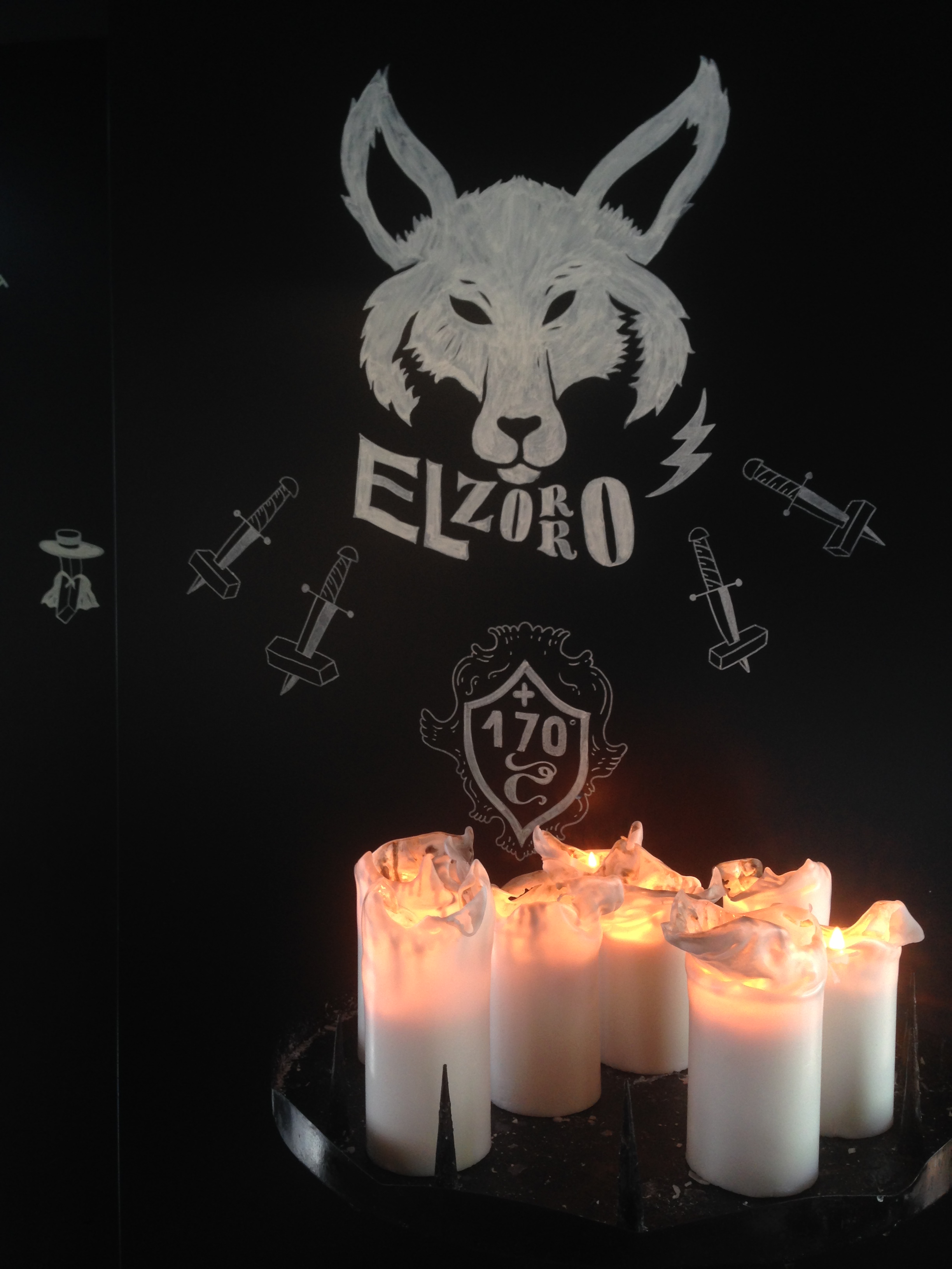 Op de tafels staan grappige zinnetjes als ‘What makes you different, makes you dangerous’ of ‘Follow your heart, stay hungry, stay foolish’. De zwarte muren zijn met witte tekeningen en woorden bewerkt door Studio Bambam. Er staat een hoge tafel met een tiental dikke witte kaarsen. Aan het plafond hangt verlichting in de vorm van een lasso. En zo kan ik nog wel een tijdje doorgaan…