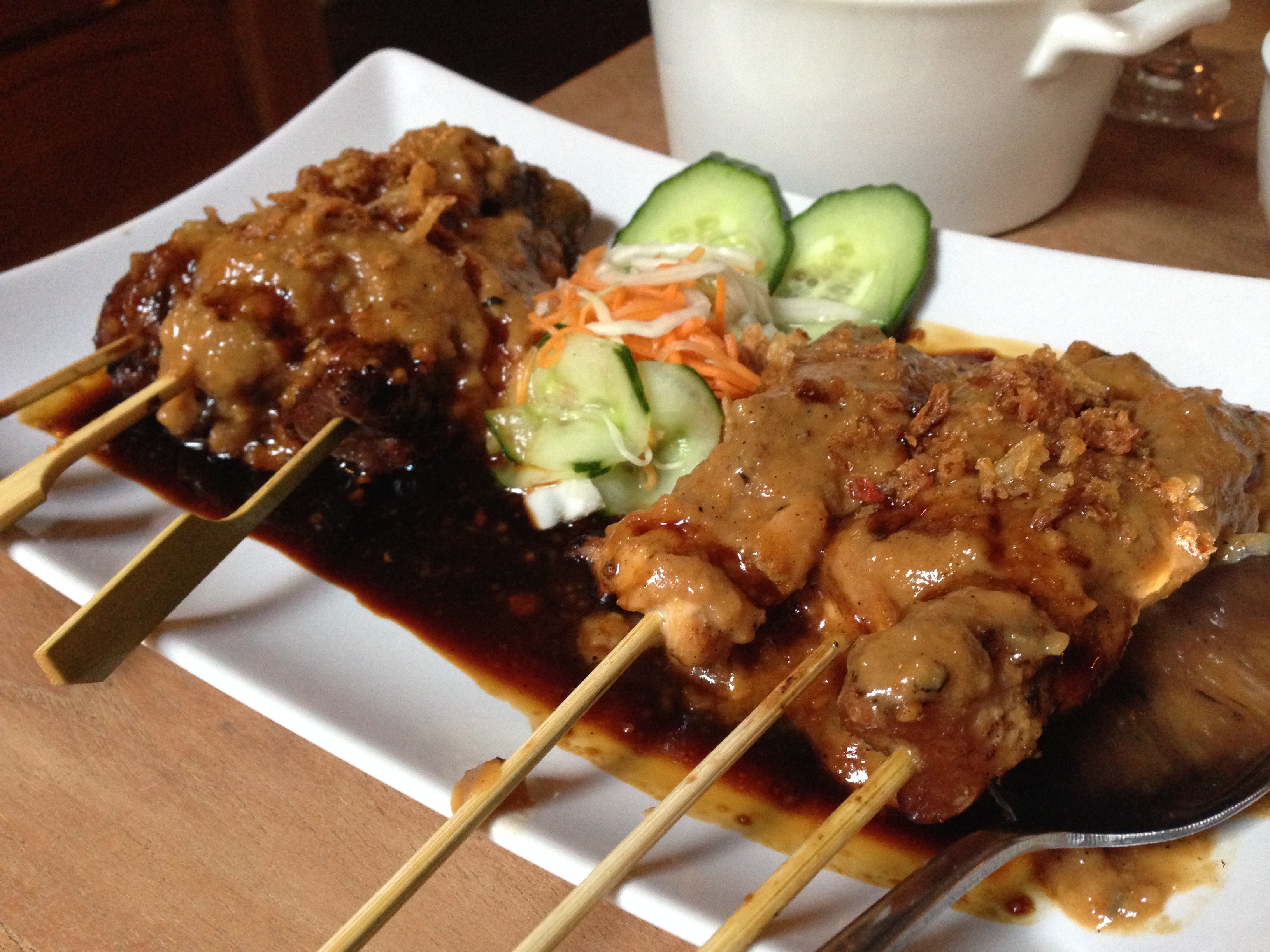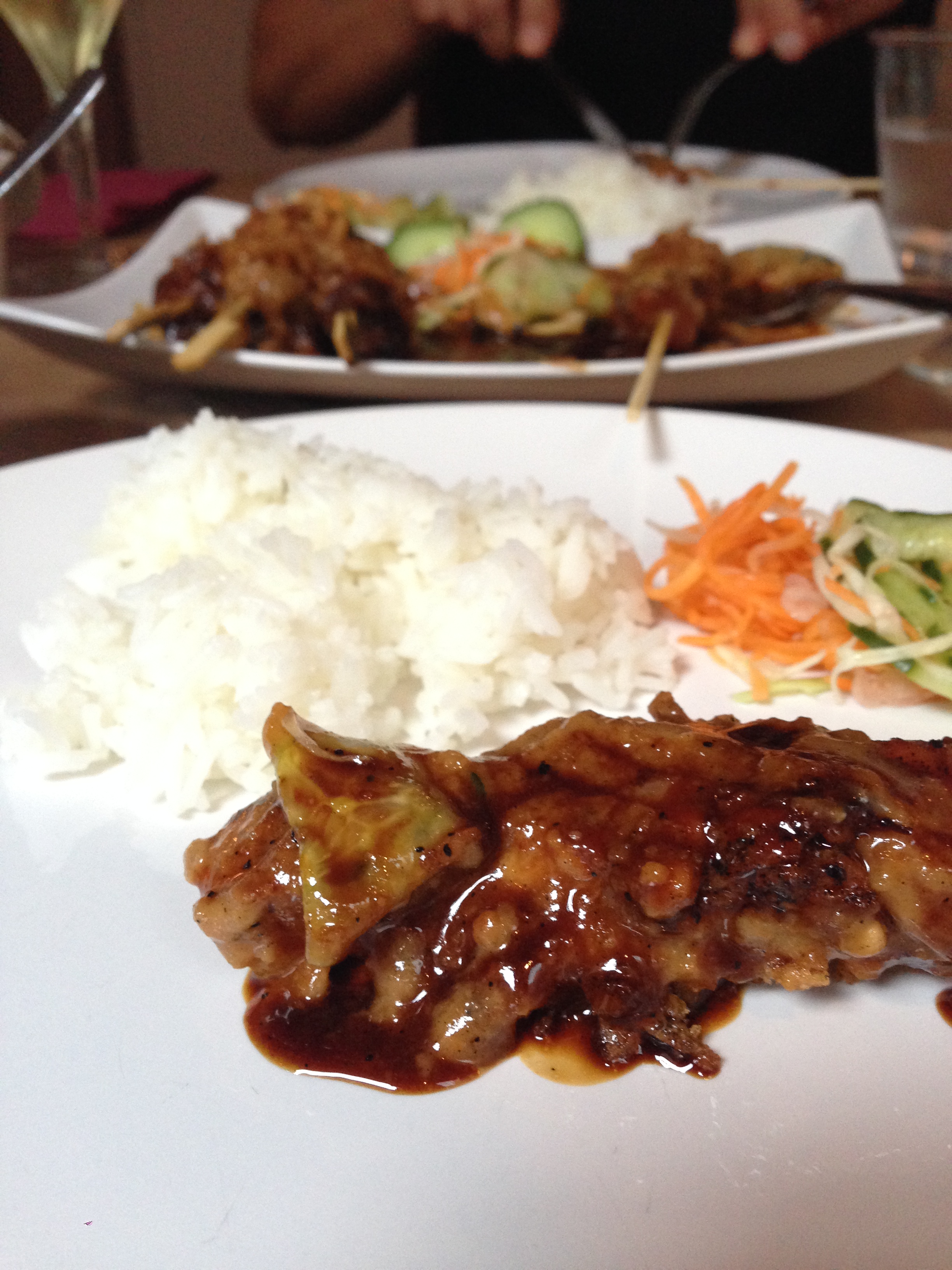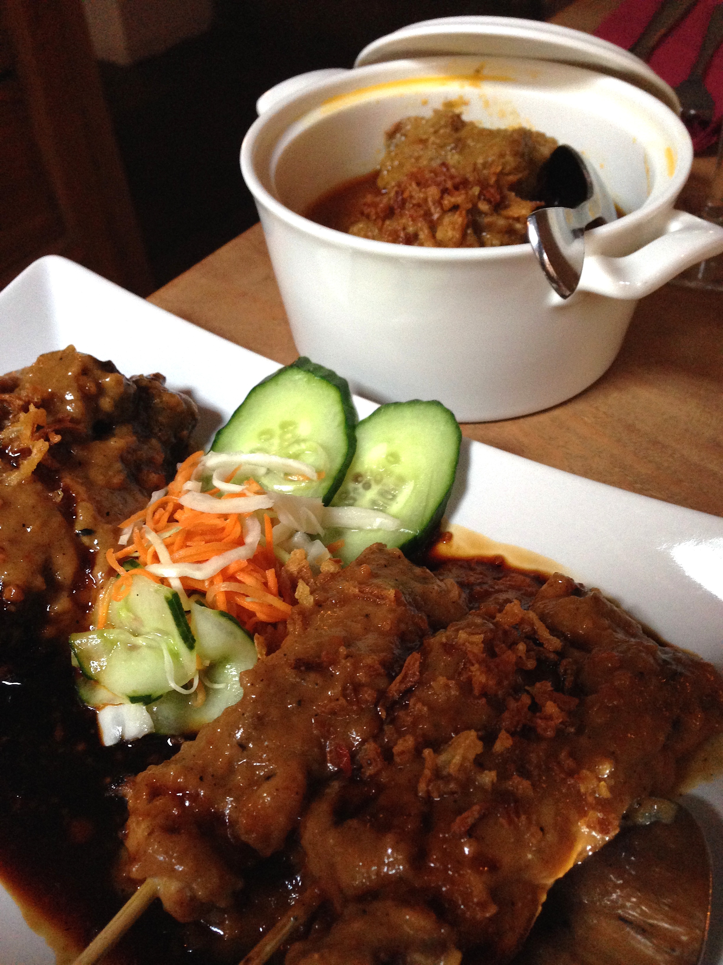 Na een eindje nabeschouwen over de voorbije feestperiode verschijnen onze gerechten. Twee borden, een kom witte rijst en de op de menukaart aangekondigde atjar (zoet-zure groenten) zijn de voorbodes. Daarna volgt een langwerpig bord met de verrukkelijk ruikende brochettes en een pot met het gestoofde rundsvlees.