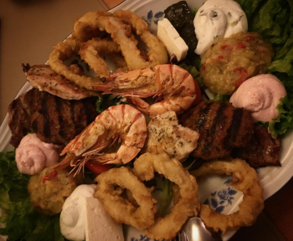 Daarbij kom nog twee soorten koolhydraten: een kom frietjes – de Belgische toets bij deze Griek – en een kom orzo (van die Griekse pasta) met tomatensaus.