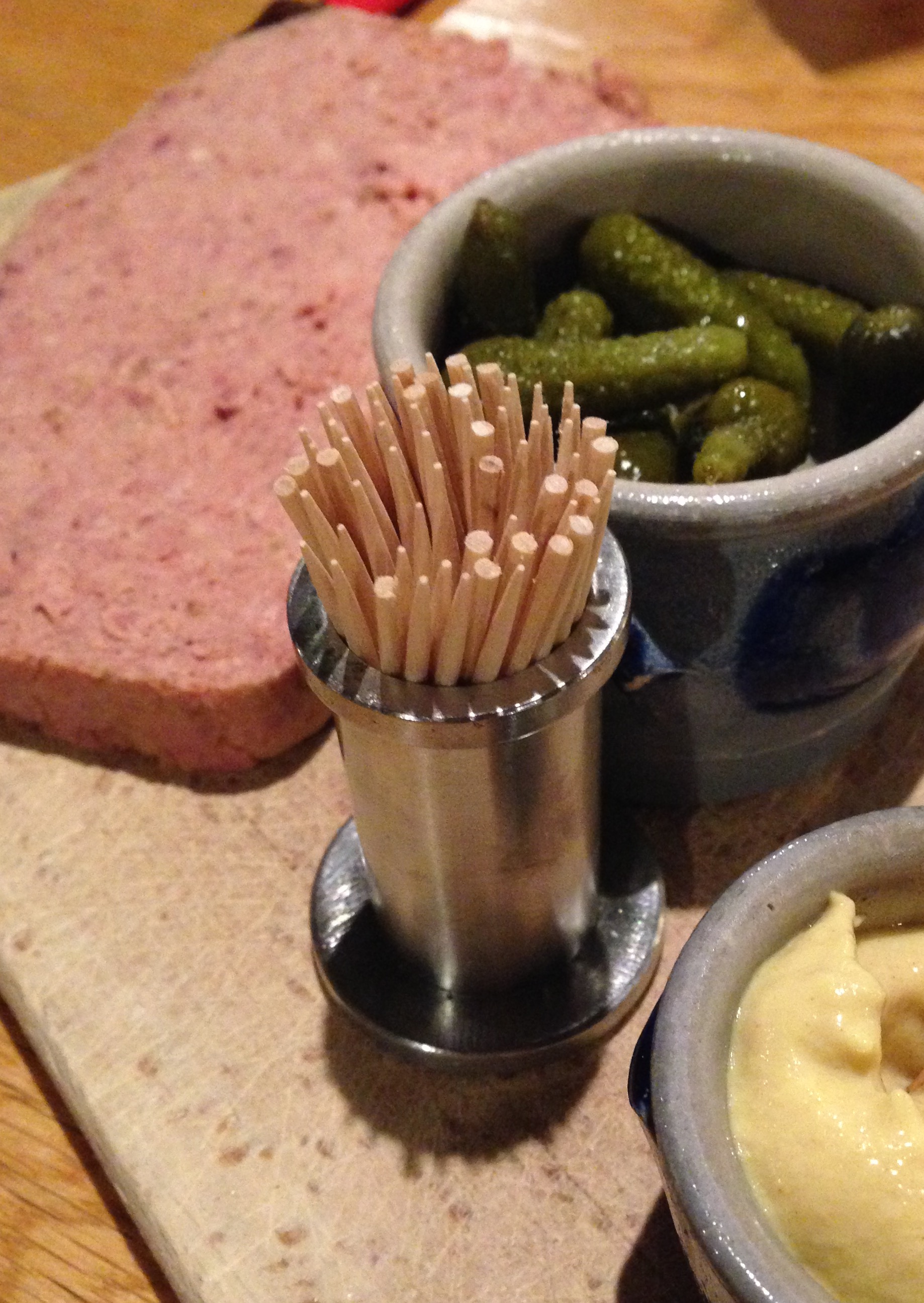 De paté landt en we kunnen beiden een lach niet onderdrukken. Op de plank ligt een volledige schel paté, qua volume identiek aan wat wij bij de beenhouwer of in de supermarkt kopen om een ganse week boterhammen of toastjes mee te smeren. En deze royale hoeveelheid mogen we nu dus even als starter naar binnen werken! Dan zwijg ik nog over de garnituren: augurken, zilveruitjes en mosterd. Het woord ‘doggybag’ valt al, maar uiteindelijk merken we toch dat we al babbelend tot 75% van de paté in vierkantjes snijden en consumeren. Mijn vriend bestelt nog een blonde Sint-Bernardus van ’t vat en zo overbruggen we ons hongertje – wegens enkel nog maar ontbijt die dag – tot aan de steak.