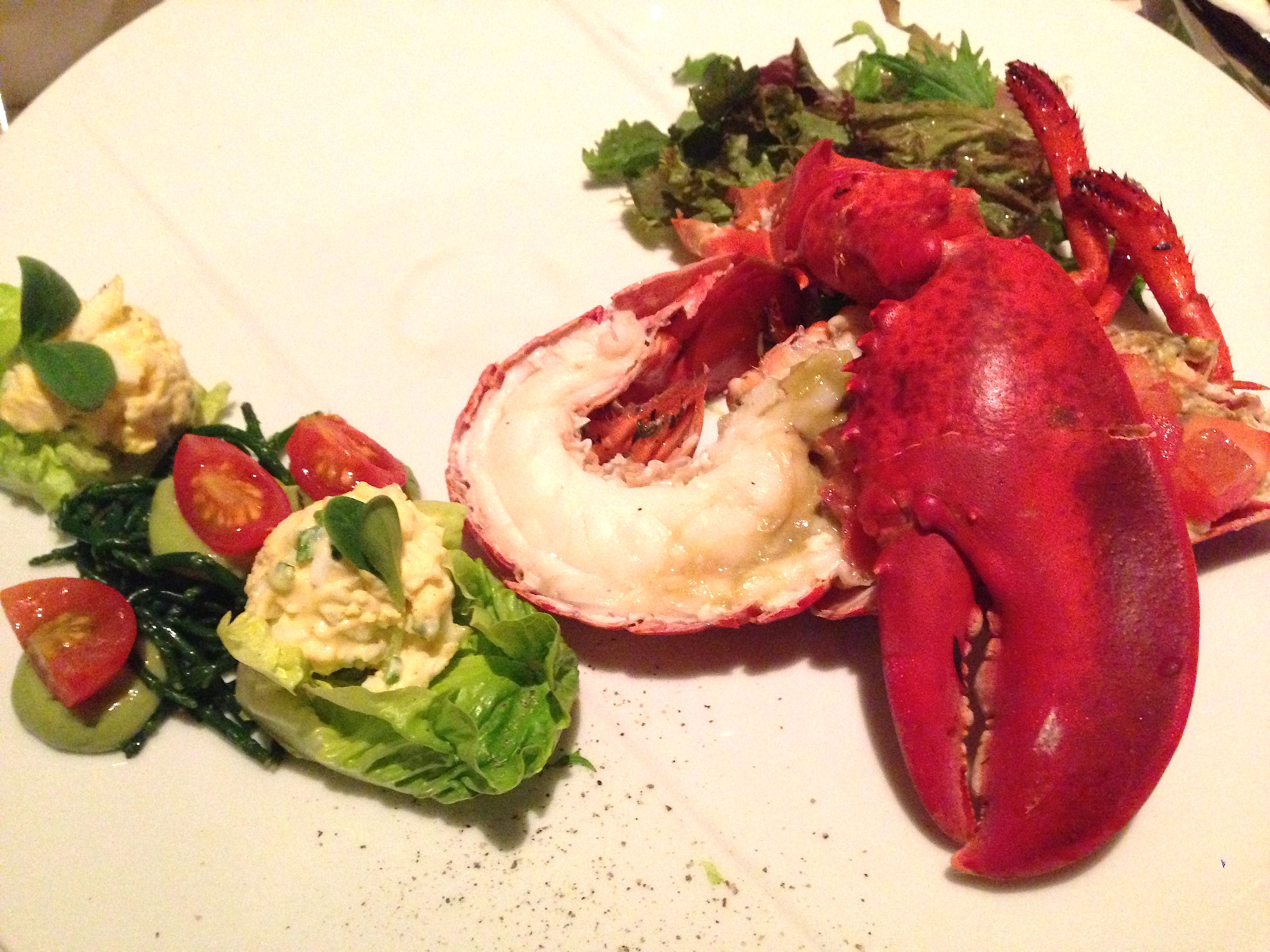 Niet veel later volgt de eerste halve kreeft. De kreetjes bij The House Of Eliott zijn niet overdreven groot en tegelijk vol van smaak. Deze gang is de meest klassieke en tegelijk de meest pure bereiding: gewoon gekookt en lauw geserveerd met cocktailsaus. Voor mij ligt er eigenlijk al iets te veel extra op het bord: een beetje sla tot daar aan toe, de eiersla en de kerstomaatjes werken ook wel. Maar de gebakken en later afgekoelde zeekraal en de toefjes met avocado hoeven voor mij helemaal niet. Klassiek mag klassiek zijn.