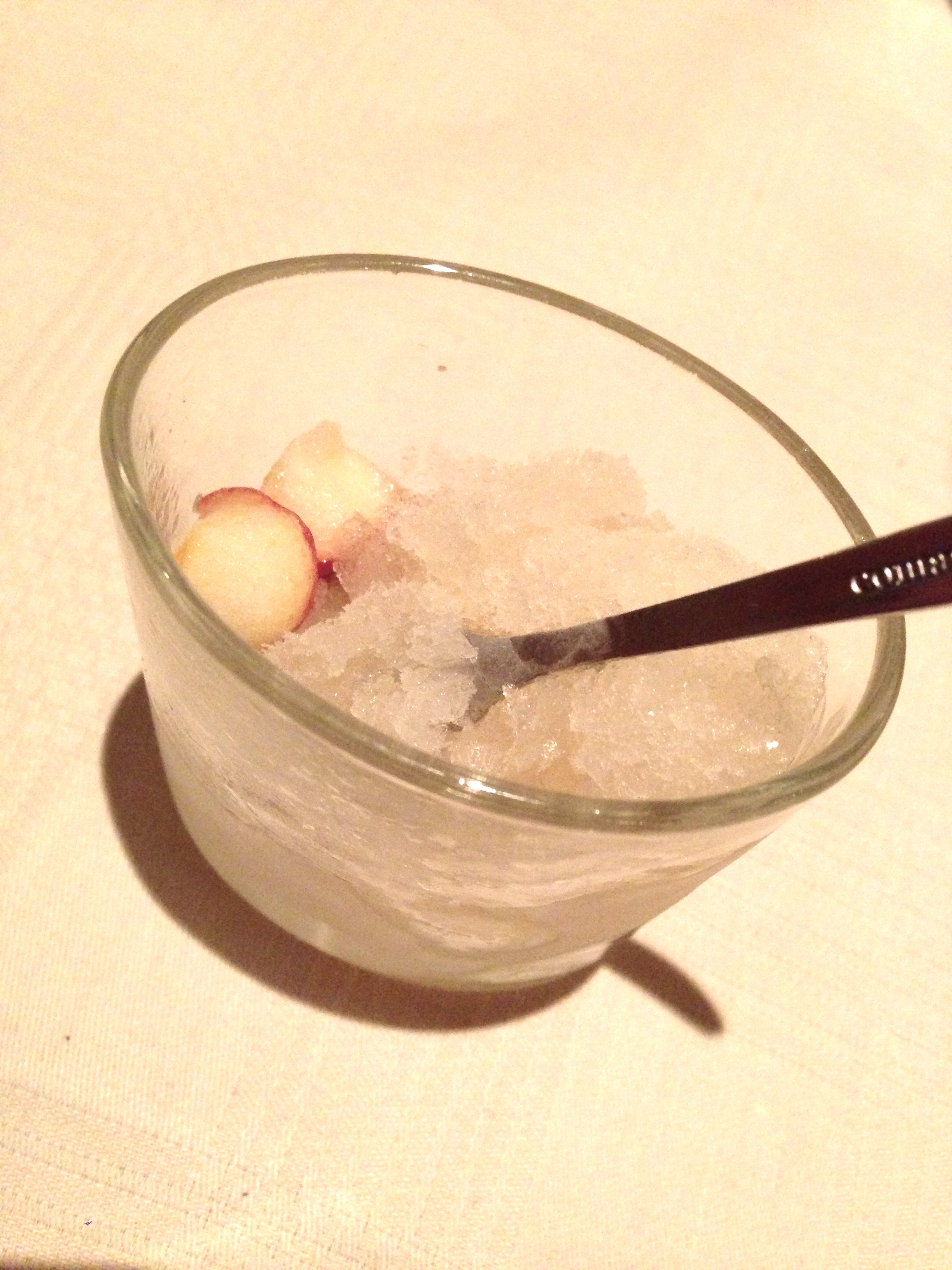 Dan duurt het een tijdje vooraleer het hapje komt: granité met calvados en appel. Lang geleden dat ik nog een sorbet of zo als tussengang geserveerd kreeg. Die gewoonte lijkt zo goed als begraven in de hedendaagse keuken. Lekker verfrissend wel!