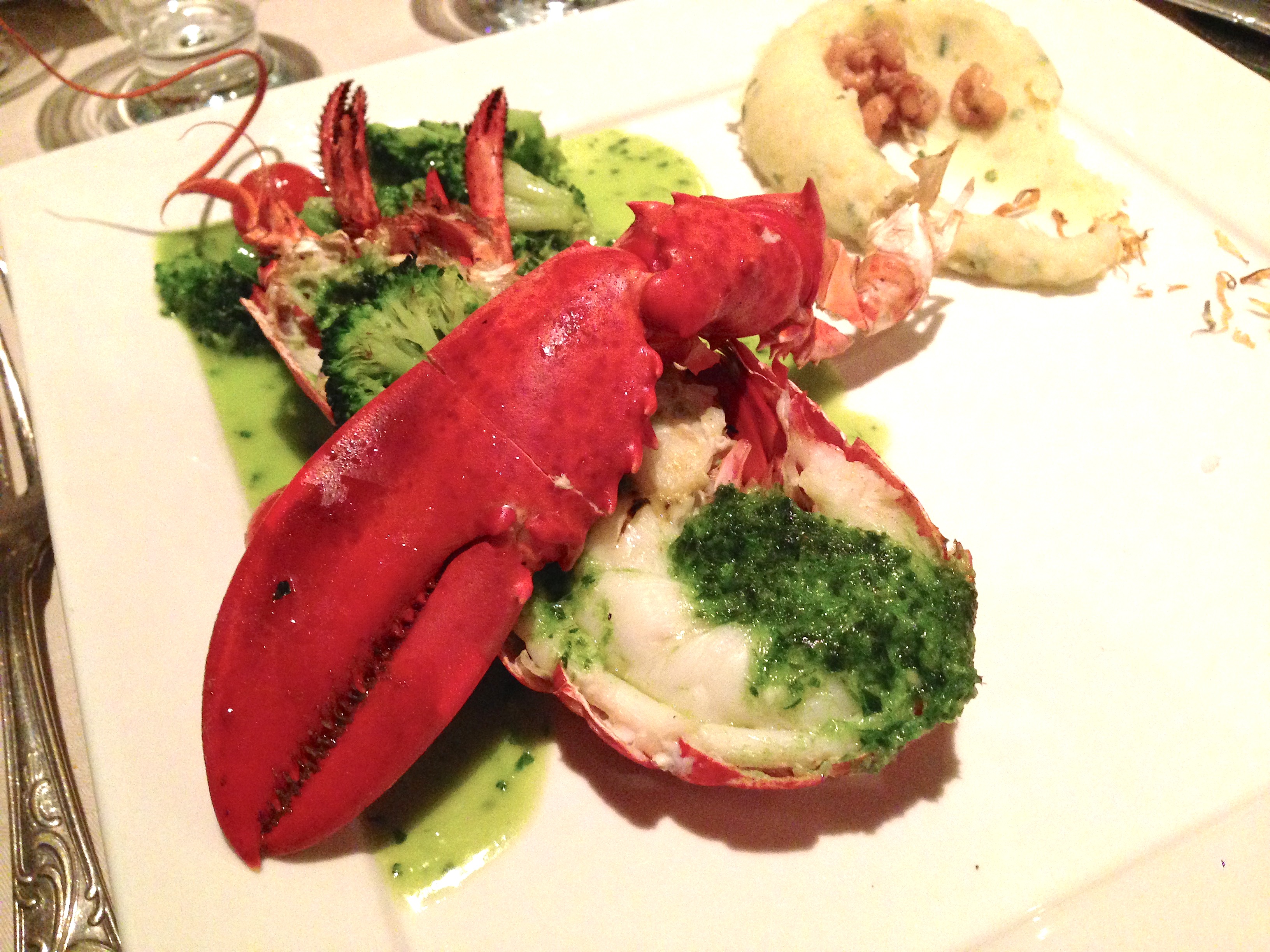 Nog even wachten later volgt de tweede kreeft: we zijn beiden voor de lookboter, kerstomaatjes en broccoli gezwicht. Ondanks het feit dat de broccoli mij niet echt aanspreekt, bevalt deze bereiding. De kreeft is ditmaal in de oven gegaard en minstens even lekker als de vorige. En misschien is het omdat wij (onder impuls van Pascale Naessens) thuis steeds minder koolhydraten eten dat de hierbij geserveerde puree zo immens smaakt. Ik geniet echt van elke hap, zelfs de happen met broccoli. Mijn lief is nog iets hardnekkiger dan ik en van iedere halve kreeft blijft in zijn geval enkel nog de schaal over. Fijn om de jarige zo te zien opgaan in het menu!