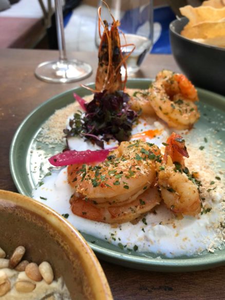 We worden verder gevoed met tiger prawns with coconut, lime and peanut. Dit bordje kan mij die middag het minst bekoren, ook al zien de tijgergarnalen er beeldig uit… Het voelt aan alsof we een omweg naar Thailand maken om dan terug in het Midden-Oosten te landen. Niets mis met Thailand, alleen proeft dit te veel als rauwe en dus onverwerkte kokosmelk.