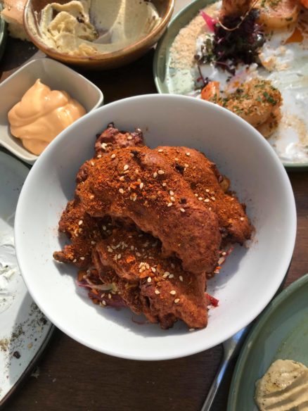 De knipoog naar KFC maakt dan weer wél indruk op mij: Dukkah Fried Chicken (kortweg DFC) with chicory egg salad. De stevige smaken dringen meteen door tot de kern van je smaakpapillen en daar hou ik wel van… Erbij hoort een al even pittige dipsaus: mayonaise op smaakt gebracht met sriracha. Sinds Sergio Herman in Simple Food toegaf dat hij lichtjes sriracha verslaafd is, schamen wij ons thuis ook niet langer om de bus op tafel te zetten in plaats van ketchup. We like it hot!