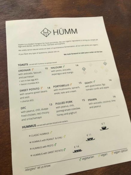 Achteraf vroeg een foodie vriendin mij wat ik van Hümm vond. Ik antwoordde met ‘Niet spectaculair…’, niettemin nuanceer ik dat achteraf toch even. Want Hümm heeft héél veel troeven: een toplocatie, een schitterende inrichting, een vriendelijke en flexibele ober, natuurwijnen van Roeland Fort, een eigentijdse keuken. Alleen verwachten mijn verwende smaakpapillen misschien net iets meer bommetjes, al speel ik het spel wellicht niet helemaal eerlijk door de lat daar te leggen voor een gezellige eetbar.