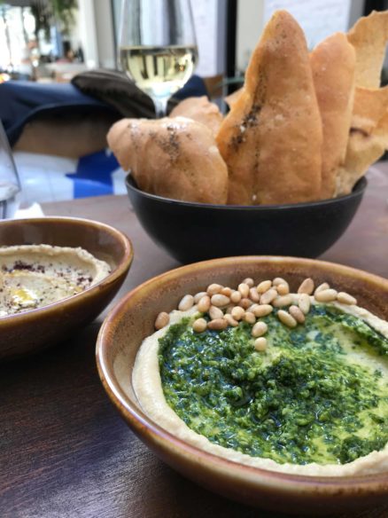Als eerste verschijnt de hummus with Persian bread in twee variates: classic hummus en hummus with pesto. Een gepaste opwarmer in een kikkererwtenbar, zeker in combinatie met dat knapperige Turkse brood. Dat is trouwens het brood dat ze ook voor de toasts gebruiken, merk ik later wanneer er nog latere lunchers dan ons arriveren.