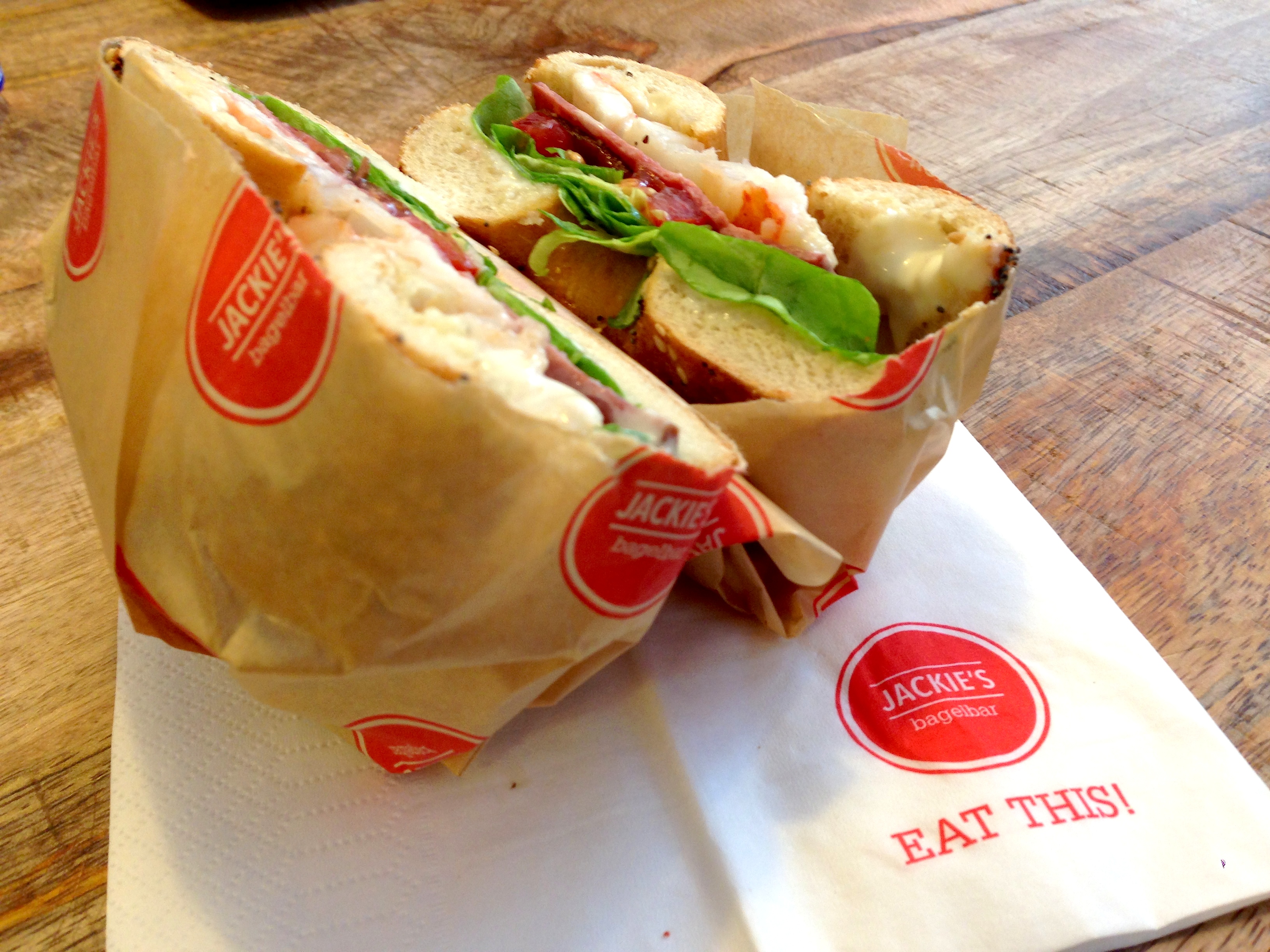 Over de smaak kan ik kort zijn: ver-ruk-ke-lijk! Surf & turf (oftewel de combinatie van iets uit de zee met iets van op het land) houdt altijd een zeker risico in, maar pastrami met scampi combineren lukt zeer zeker. De groenten en de frisse caesar dressing werken het geheel af. Als bagel koos ik trouwens voor de everything (met ui, look, sesam- en maanzaad) en daar heb ik in geen geval spijt van. De bagel is overigens tot op de seconde perfect gebakken, dat zie ik voor mijn ogen gebeuren wanneer Jackie tijdens het opnemen van de bestelling even in de oven voelt en nog 35 (!) seconden extra aantikt op haar keukenwekker. Ik ben vrij uiteindelijk gevuld met één bagel, al zou ik uit pure goesting nog wel een tweede op kunnen…