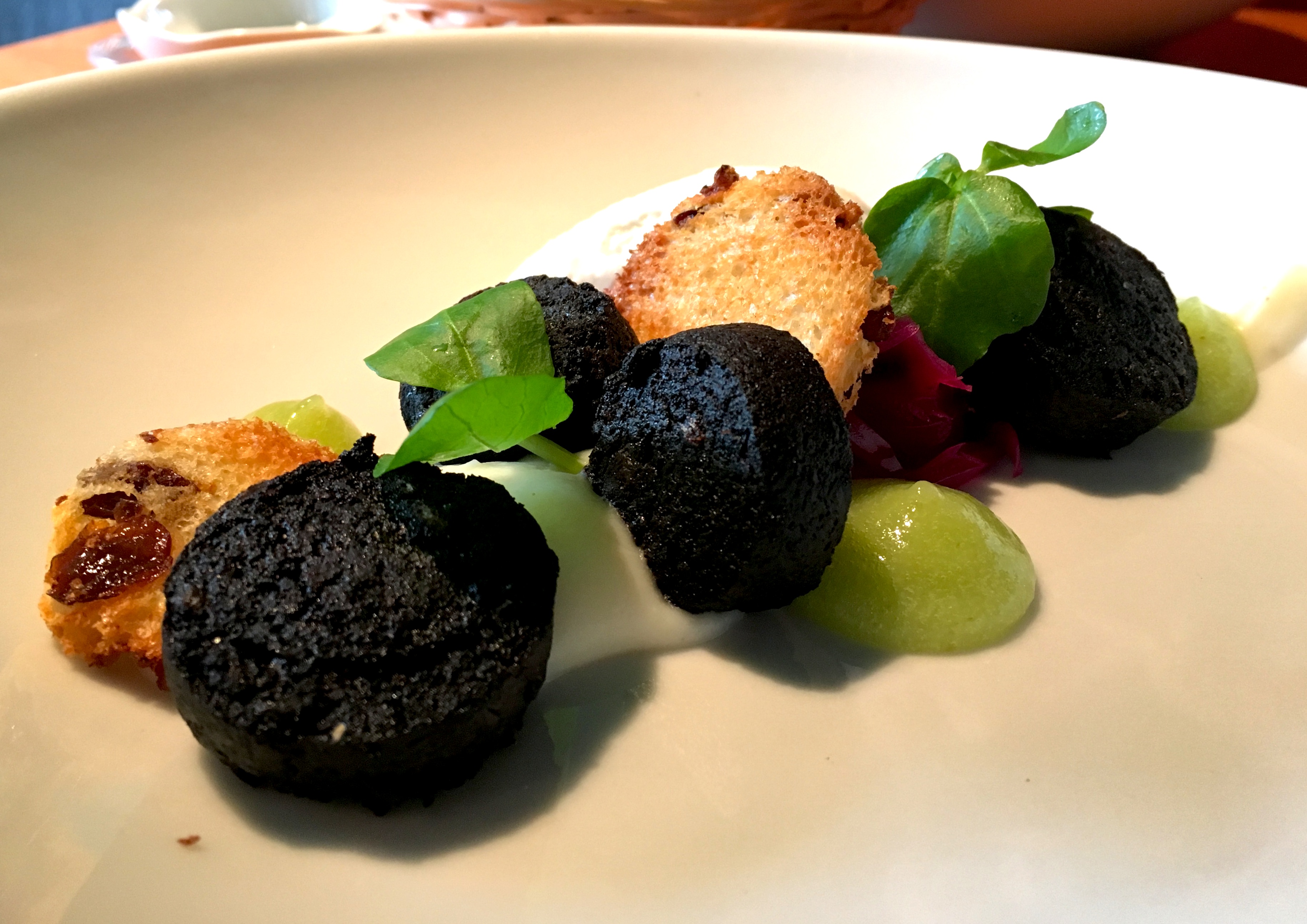 Vrij vlot volgt het voorgerecht: boudin noir van Noyen, knolselder, groene appel, rozijnentoast, opgelegde rode kool. Op het bord ligt een eigentijdse compositie van ingrediënten die als combinaties uit onze ‘erfgoedkeuken’ kennen: denk aan rode kool – dit keer in een originele opgelegde versie – met appel, en diezelfde appel doet het als Vlaamse kost ook goed met bloedworst. Verder komt er knolselder terug in de puree en het ijs. Daar mocht de chef wat mij betreft stoppen, het rozijnenbrood en de waterkers voegen voor mij weinig toe aan het gerecht. Ook al begrijp ik dat het visueel wel helpt. Samengevat een geslaagde winterse start!