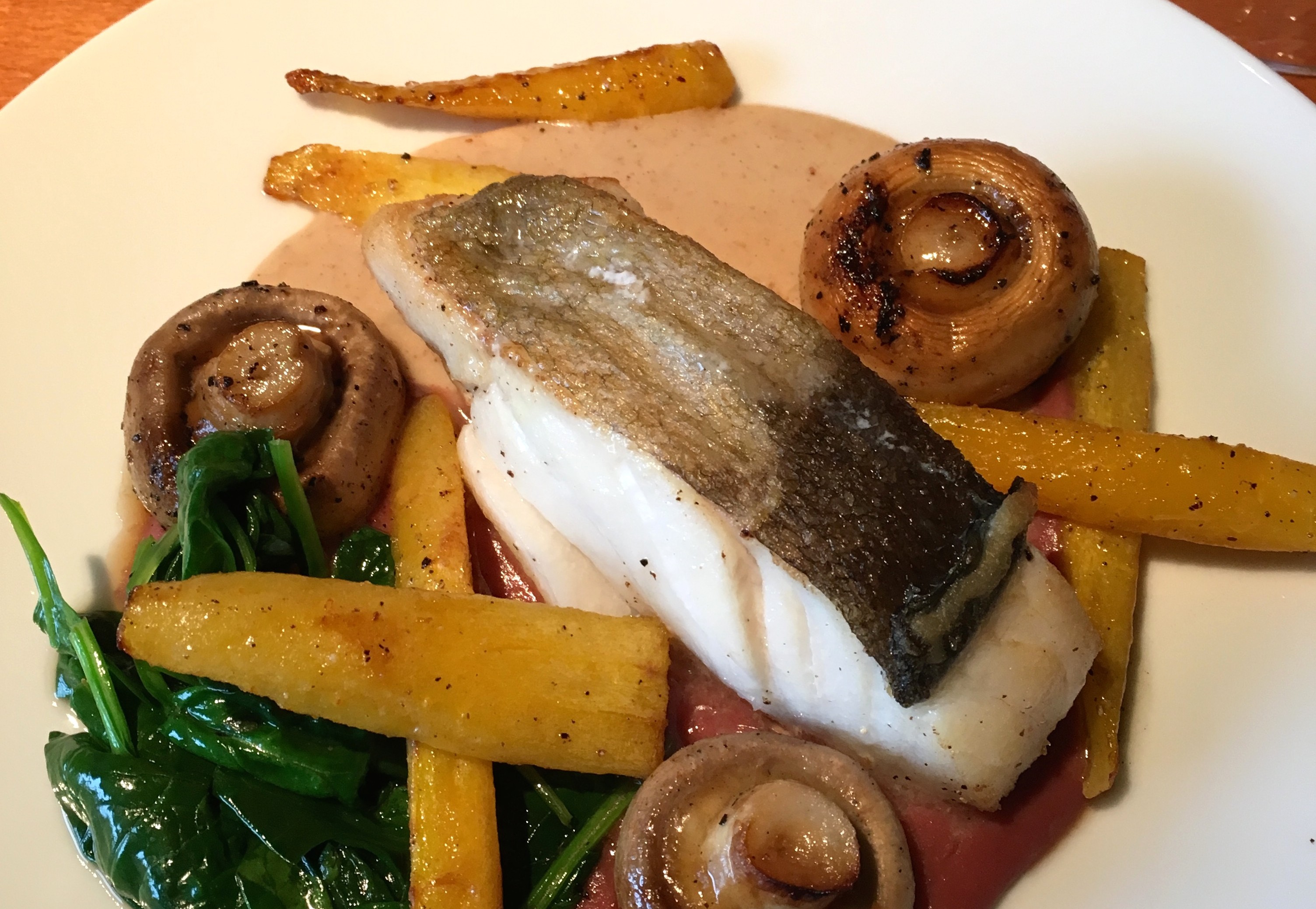 Als hoofdschotel krijgen we kabeljauw, roze pepersaus, crème van rode ui, spinazie, gele wortel voorgeschoteld. Je merkt meteen dat de vis perfect gegaard is én dat het om een vrij stevige gang gaat – zeker als je prijs/kwantiteit in overweging neemt. Dan alleen de kwaliteit nog checken… De gele wortel proeft zoet, de volledige champignons en de verse spinazie maak ik zelf ook graag op die manier klaar. Dat visje en de groenten accorderen prima met de opnieuw aparte crème van rode ui. Aan de roze pepersaus – die overigens vrij fel doorsmaakt – in combinatie met kabeljauw moet ik in eerste instantie even wennen, maar ik hou er wel van om uit mijn comfort zone getrokken te worden als het op eten aankomt. Toch vind ik het ook hier net iets te veel smaken samen.