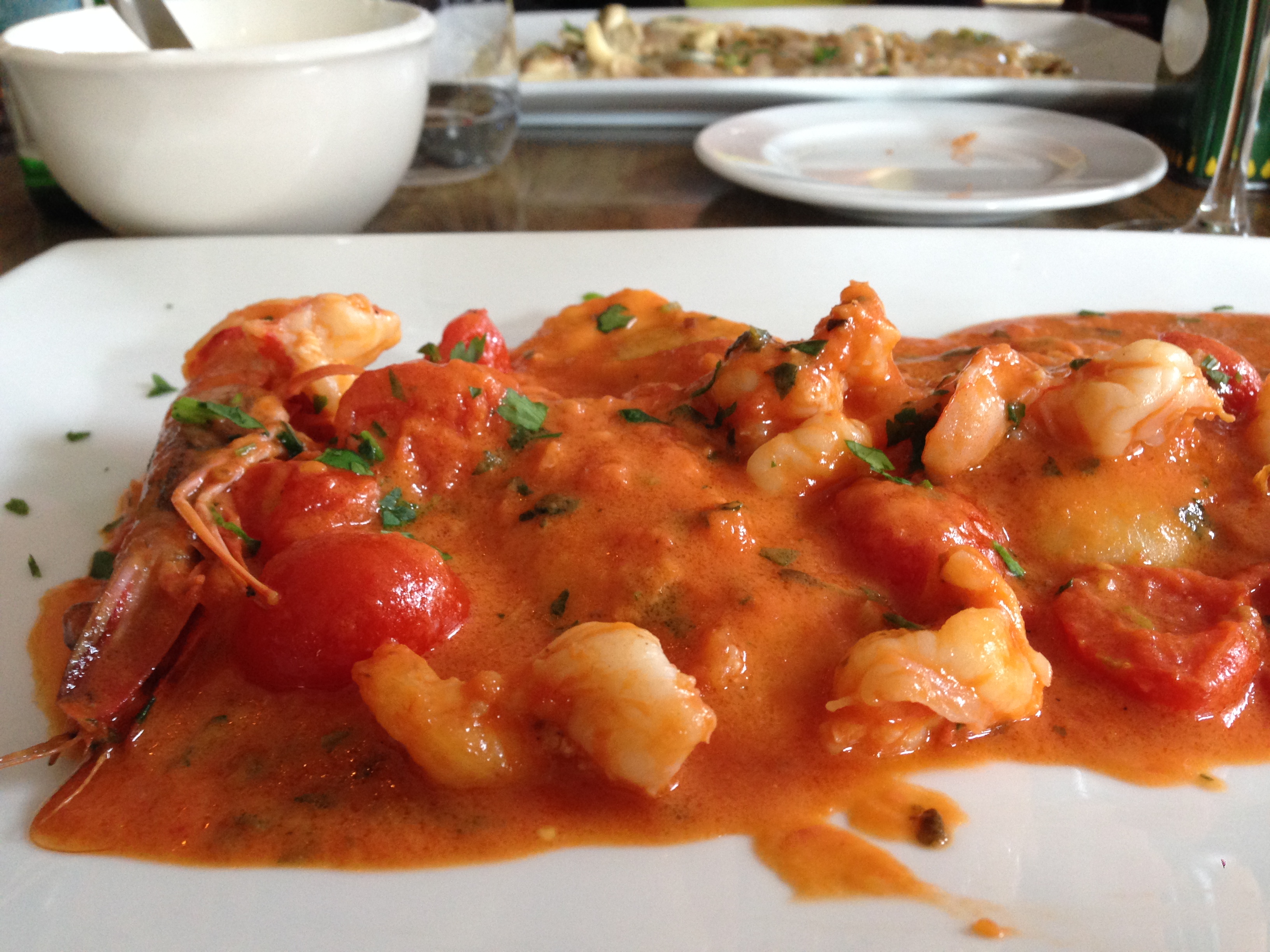 Ja, hier had ik zin in! Een zestal stevige ravioli met een kreeftenvulling – uiteraard geen 100% kreeft, want dat kan natuurlijk niet voor de prijs van € 19,50 – in een tomatensausje. Er ligt helaas maar één stevige gamba op het bord, maar de scampi zijn talrijker aanwezig. Hoewel dit gerecht het niet echt vraagt, strooi ik toch wat parmezaan en val ik aan. Dit is zonder meer een geslaagde ravioli, die er mij nogmaals aan doet herinneren dat ik hier dringend thuis eens wat experimenten rond moet opzetten.
