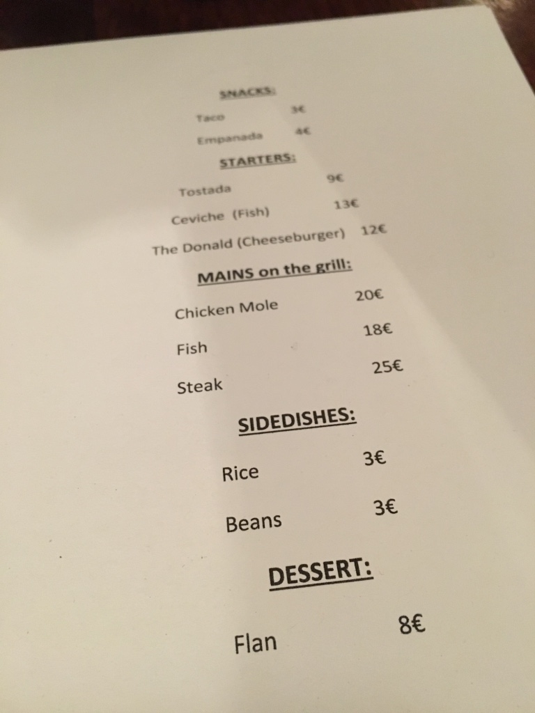 Onderweg naar huis bel ik even om te informeren of reserveren noodzakelijk is. Blijkbaar niet, behalve als je met een groep van meer dan acht personen van Mexico wil doen. We zetten koers richting de Brabantdam en verkiezen de eetzaal achterin boven de toog in het eerste deel van De Vitrine. Deze zit ongeveer halfvol en wij installeren ons tegen de muur. De boxen blazen leuke (hiphop) deuntjes, de sfeer zit goed…