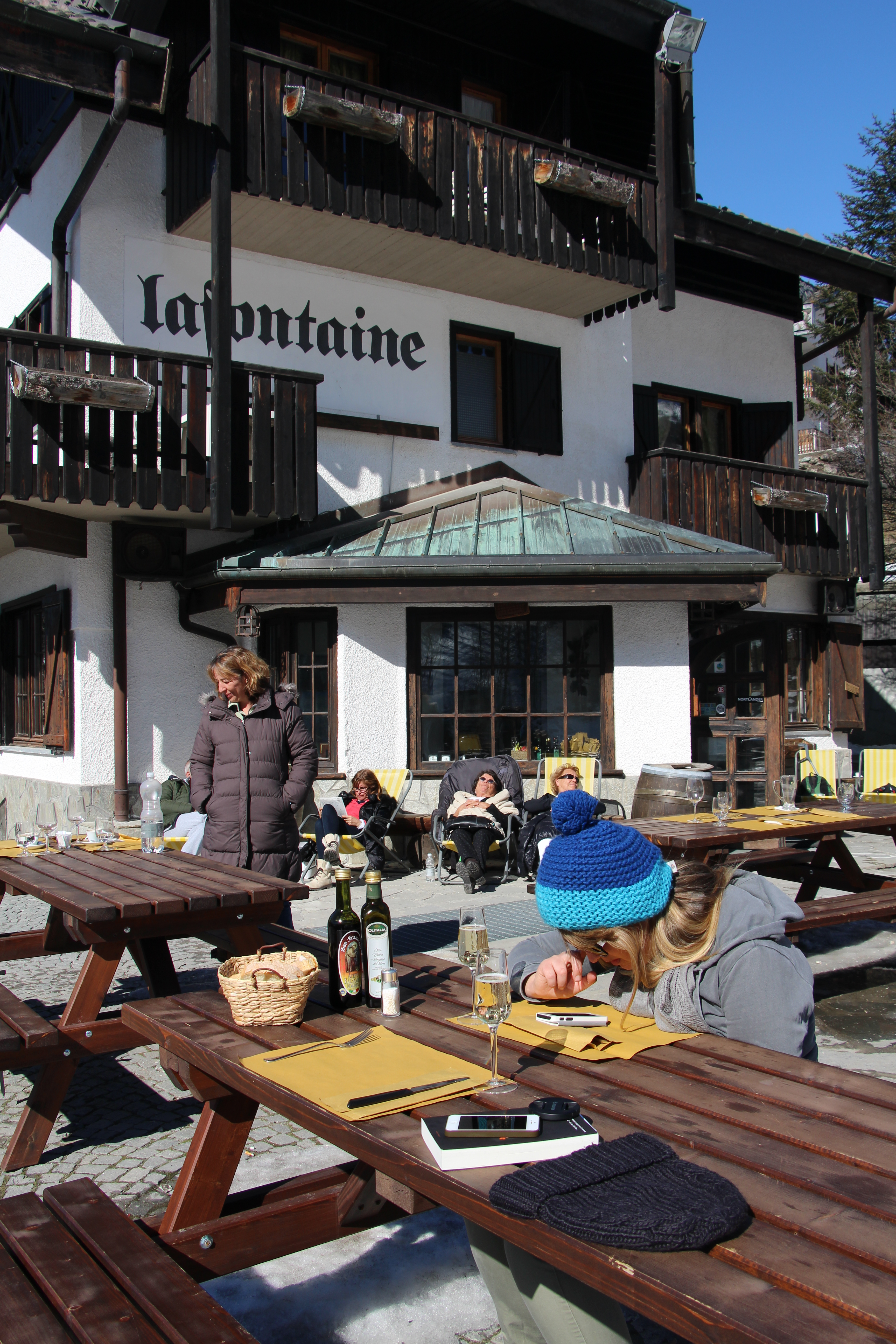 De laatste dag gaan enkel de mannen naar boven, de vrouwen doen waar ze goed in zijn: terrassen in de zon. Dat doen we bij La Fontaine, onderaan de lift in Jouvenceaux.