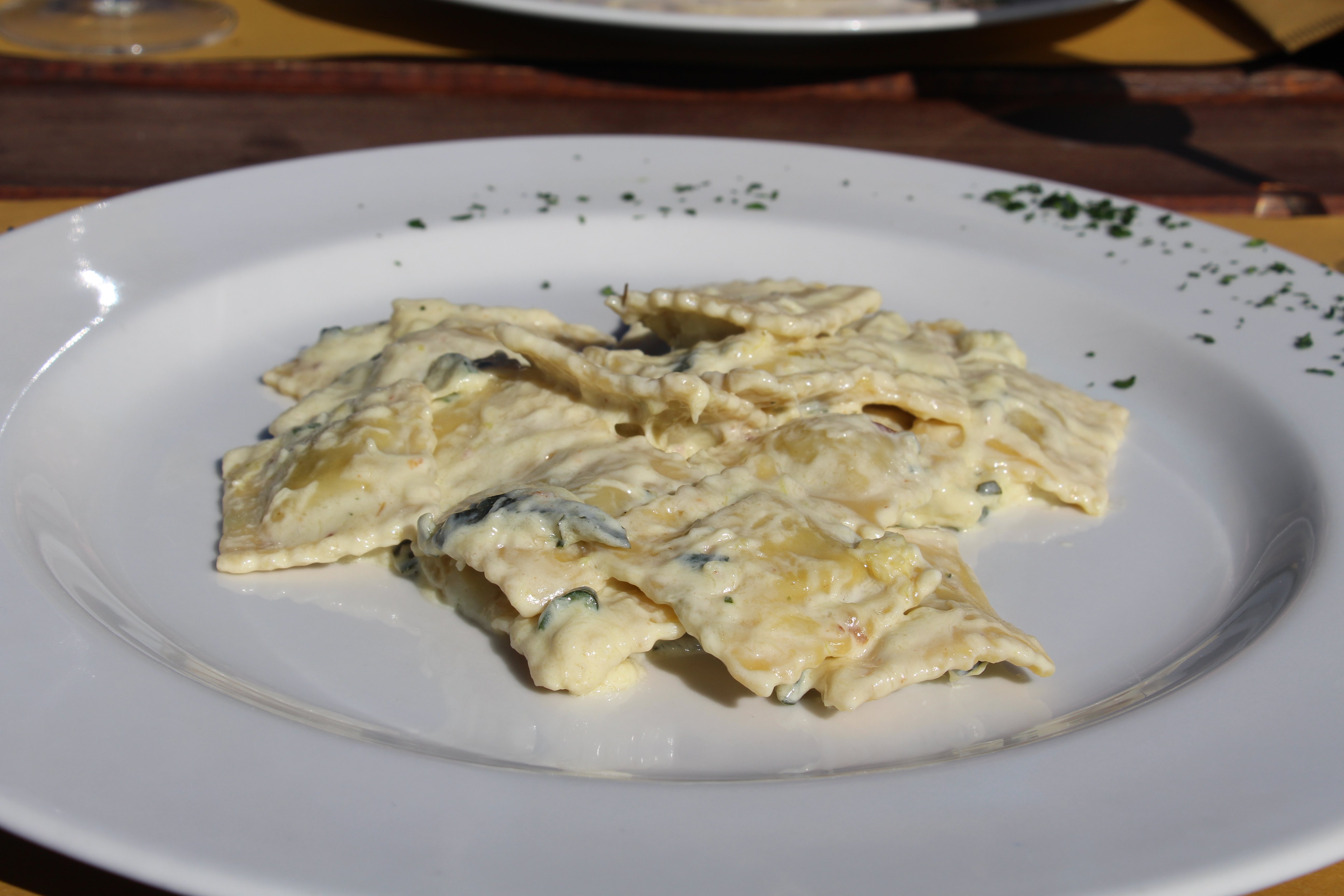 Als gerechten kiezen we elk een pasta. Exacte omschrijvingen en prijzen heb ik niet wegens te ontspannen, en dan vergeet ik al eens om menukaarten te fotograferen of mij minutieus te documenteren. Mijn vriendin kiest tagliatelli met champignons en worst, ikzelf ravioli met courgette en kaas. We delen ook nog een ‘insalata mista’, omdat ik persoonlijk vind dat pasta op die manier makkelijker verteert.