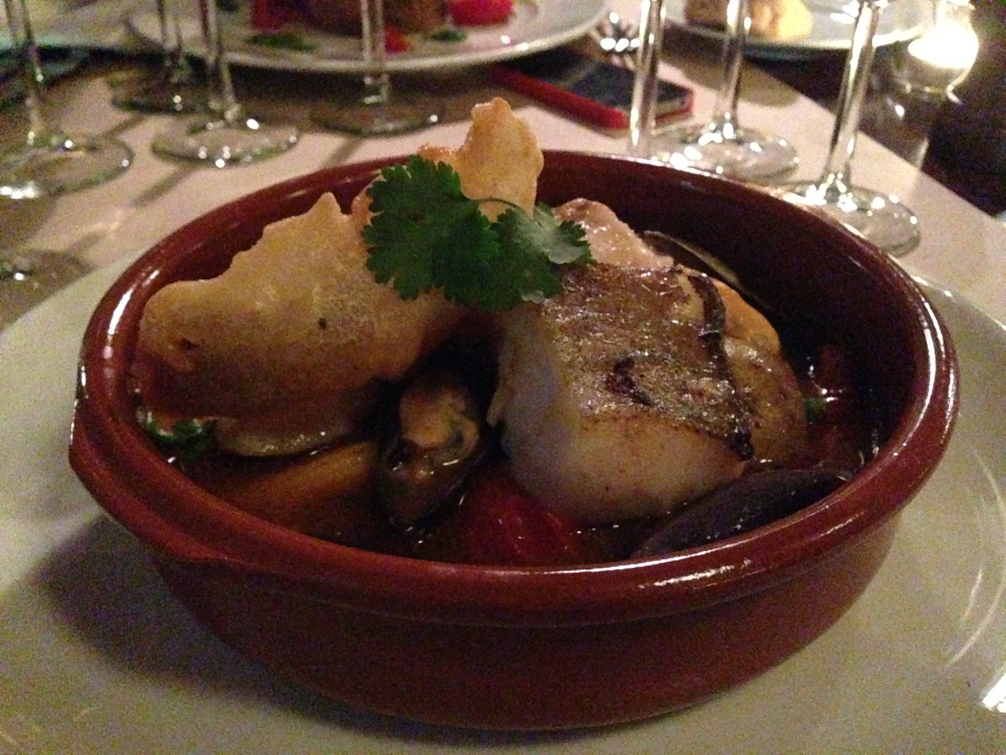 2014-09-17 20.41.04Bovenstaande foto moet zowat mijn slechtste foodpic zijn van de laatste jaren, desalniettemin wou ik een impressie geven van een geslaagd gerecht. In zo’n mooi aardewerken ovenschaaltje lacht de vistajine mij toe: een stuk gebakken kabeljauw met vel, een soort visbeignet, enkele stevige mosselen, gestoofde groenten en een kruidige saus. Echt lekker! En zo beaamt mijn linkerbuurman die dezelfde eetkeuze maakte.