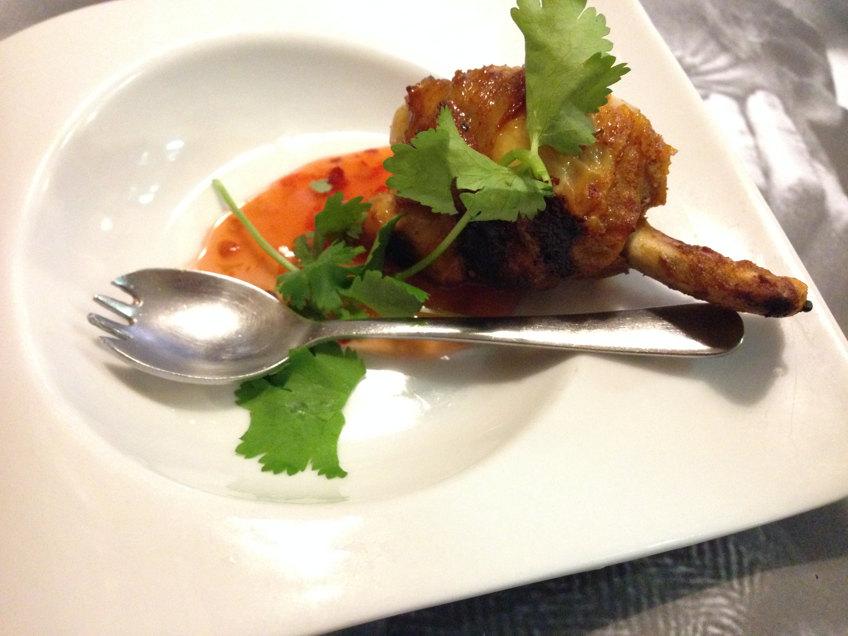 De eerste middag belanden we op de ruttel in het gezellig ogende L’Autruche vlakbij de kathedraal. Buiten haalt een krijtbord met de belofte van een lunch aan € 14,50 ons over de drempel. We klinken op Luik met een picon vin blanc (€ 4 op de kaart, € 5 op de rekening) en kijken even rond: hier wordt het eten op de rooster gelegd. Zo ook onze lunchkeuzes: brochette de boeuf (150 gr) voor hem, brochette de gambas voor haar. In de lunchprijs zit nog een glas wijn inbegrepen en een eenvoudig hapje als smaakmaker: een kippenboutje met zoete chilisaus en koriander. Sympathiek!