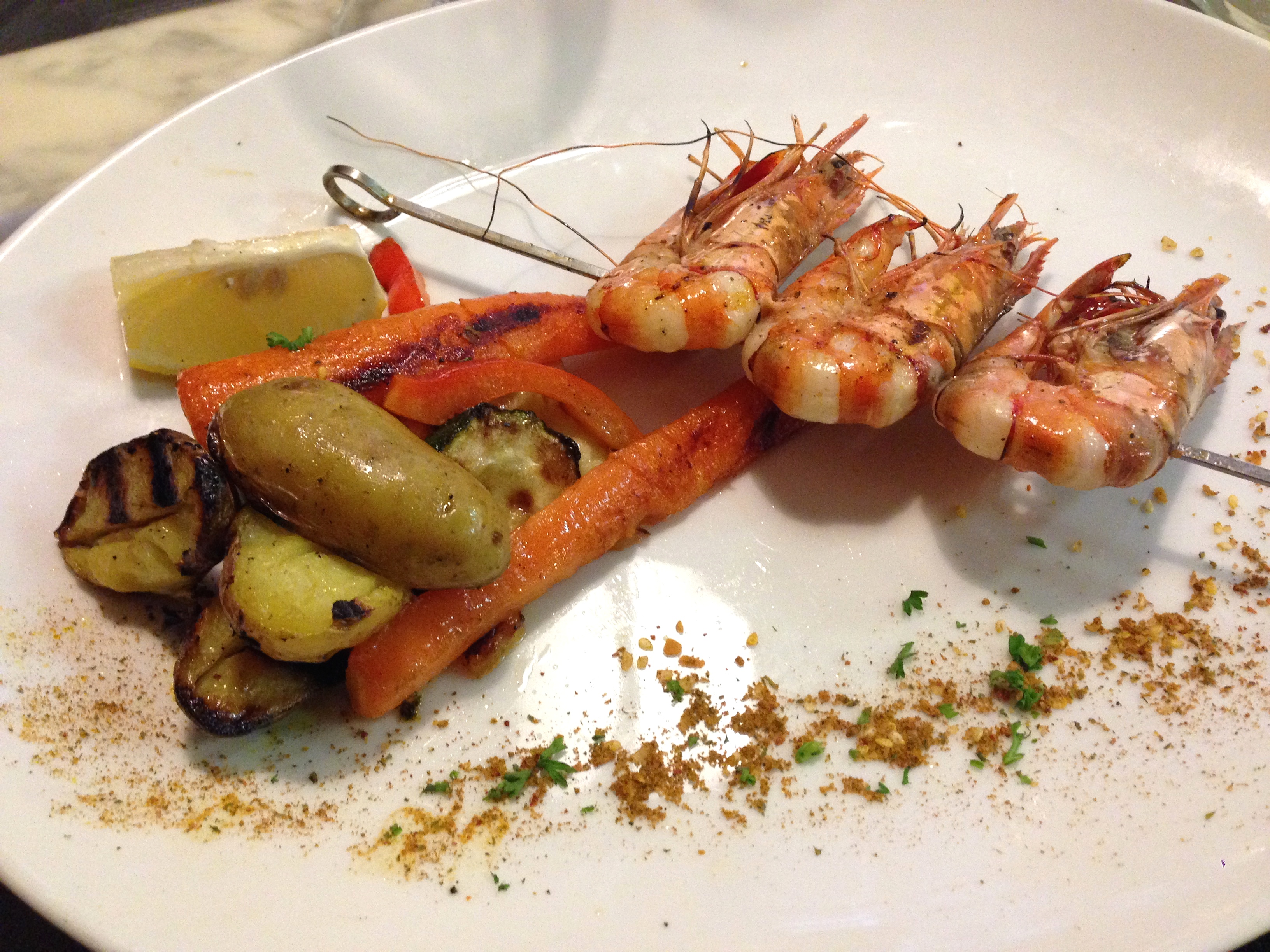Daar volgen onze borden al. Dit wordt inderdaad de lichte lunch waar we naar op zoek waren… Op het mijne ligt een spies met drie gegrilde gamba’s, daarnaast krieltjes en groenten die tevens grillstrepen vertonen. Aan de overkant een gelijkaardig gerecht met saignant gebakken rundsvlees, maar zonder de groenten (courgette, wortel, paprika).