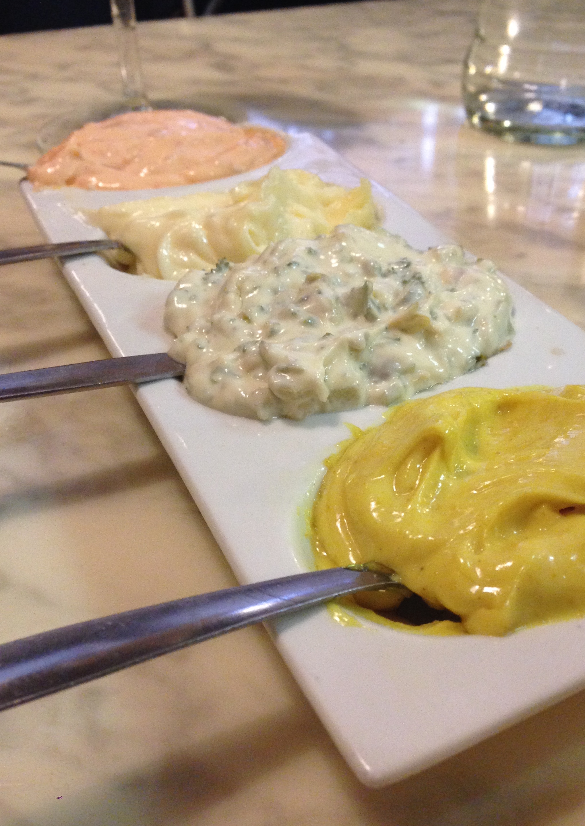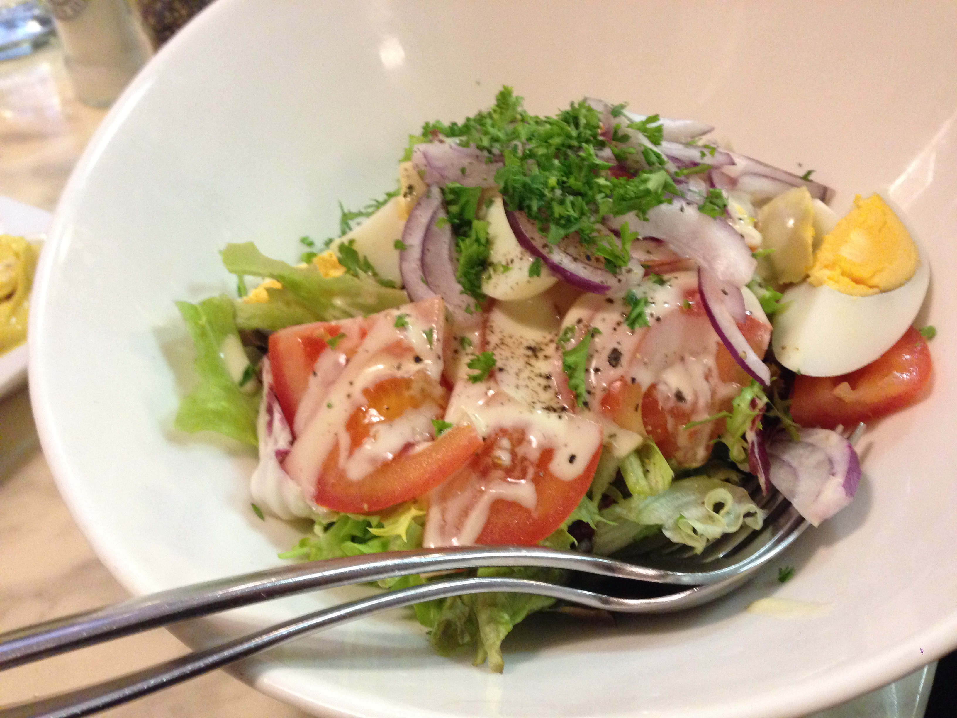 Daarbij komt een vrij ruime kom sla met tomaat, hardgekookt ei, rode ui en een frisse dressing. Overduidelijk afgewerkt met een portie liefde, peterselie en peper! Als smaakplugins verschijnen nog vier koude sauzen: curry, tartare, aïoli en piment. Mijn liefde gaat uit naar de huisgemaakte tartaar, al fluistert het currypoeder op mijn bord dat de geelste van de vier het tevens niet mis doet bij mijn gamba’s. Die beestjes eet ik trouwens met smaak en zorgvuldig op, dat kan ook niet anders met dit gelimiteerde aantal – wat ik gegeven de prijszetting van de lunch volkomen begrijp.