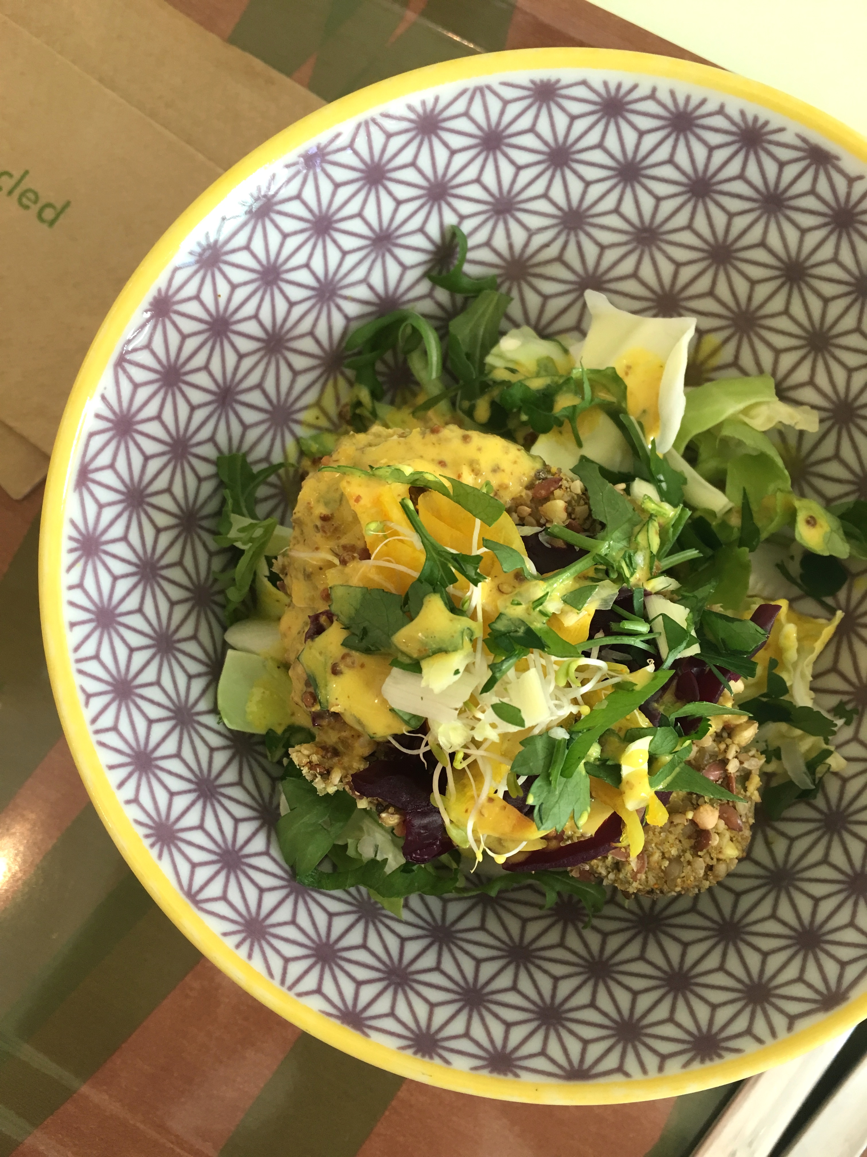 In een kleurrijk kommetje ligt mijn tot de verbeelding sprekende starter: super seed avocado (€ 3,50). Het blijkt inderdaad een avocadohelft met een korstje van zaden (waarvan sommigen met het populaire superfood-label), vergezeld door wat sla en verse kruiden. Terwijl ik dit eet, wisselen twee zinnen constant af in mijn hoofd: ‘Dit is lekker!’ en ‘Dit is gezond!’. Alleen maar positiefs dus.