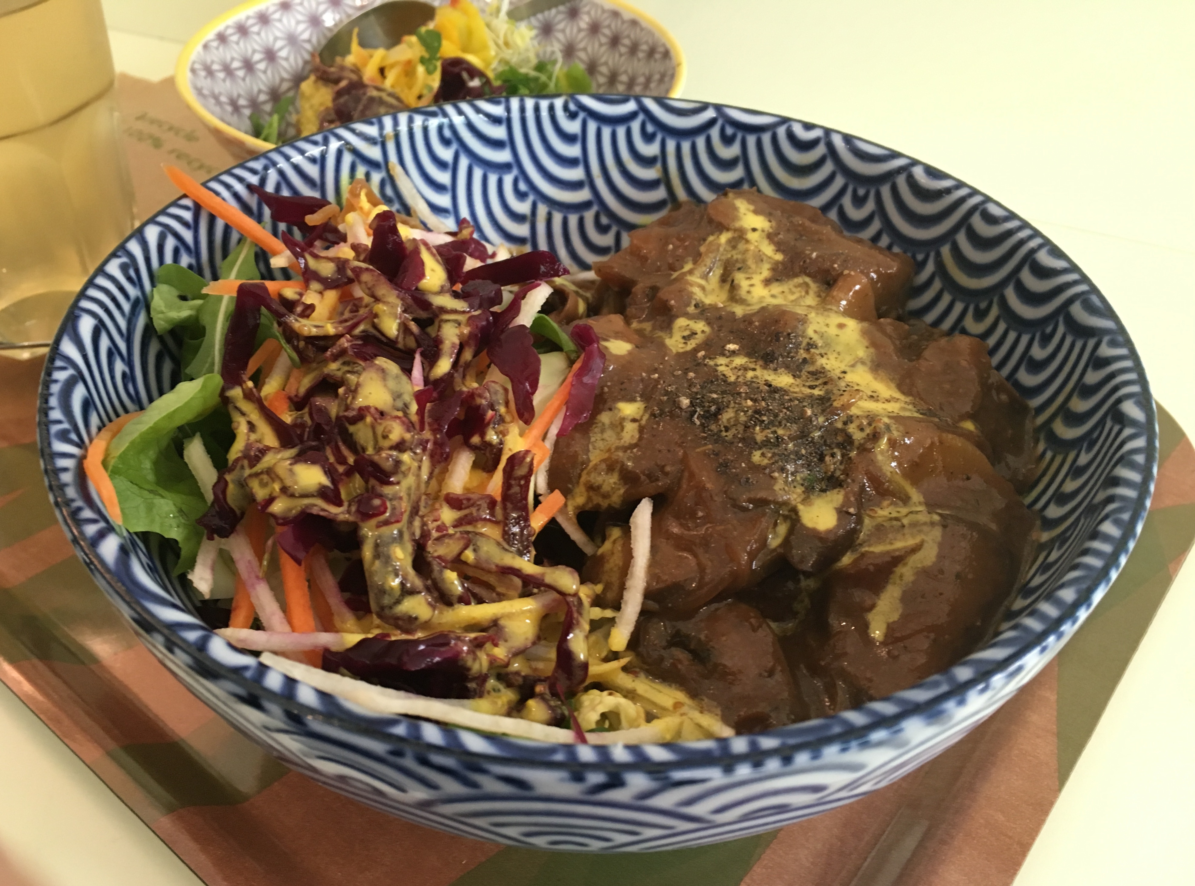 Ondertussen arriveert ook mijn hoofdgerecht: de JEFF bowl (€ 8,95) met potato, wild mushroom sauce, raw salad, aioli dressing. In geval van meenemen kost dit gerecht nog een euro minder. Opnieuw geserveerd in keramiek waarvan ik niet anders kan dan vrolijk worden… Ik had voor die prijs eerlijk gezegd niet zo’n volume verwacht. Naast het kraakverse slaatje liggen gestoomde krielaardappelen met daarover dus saus van wilde champignons, waardoor het er een beetje als Vlaamse stoverij uitziet. De smaak van deze bowl zit écht goed en al bladerend door de Weekend Knack kan ik alleen maar concluderen dat ik een happy luncher ben.