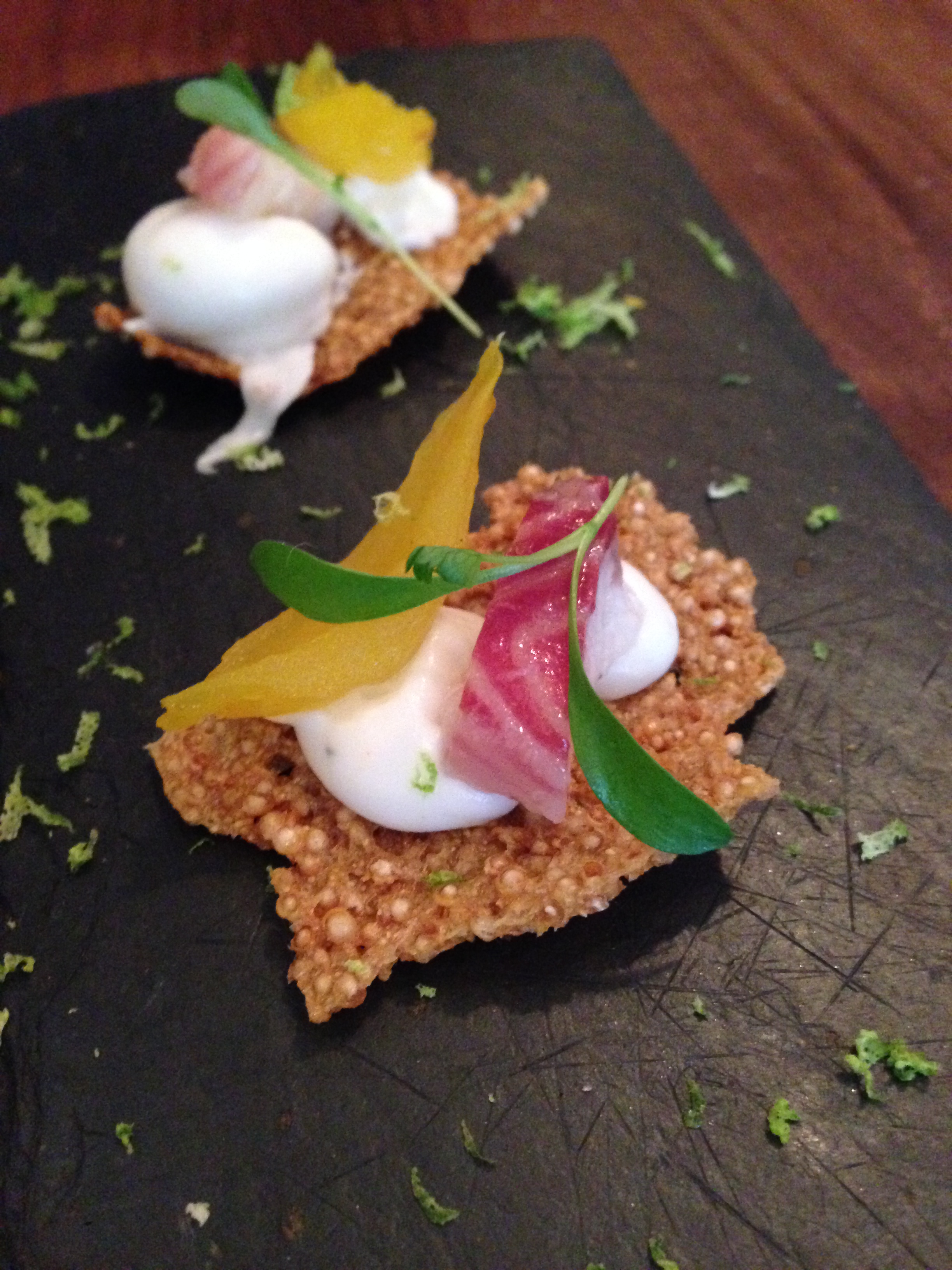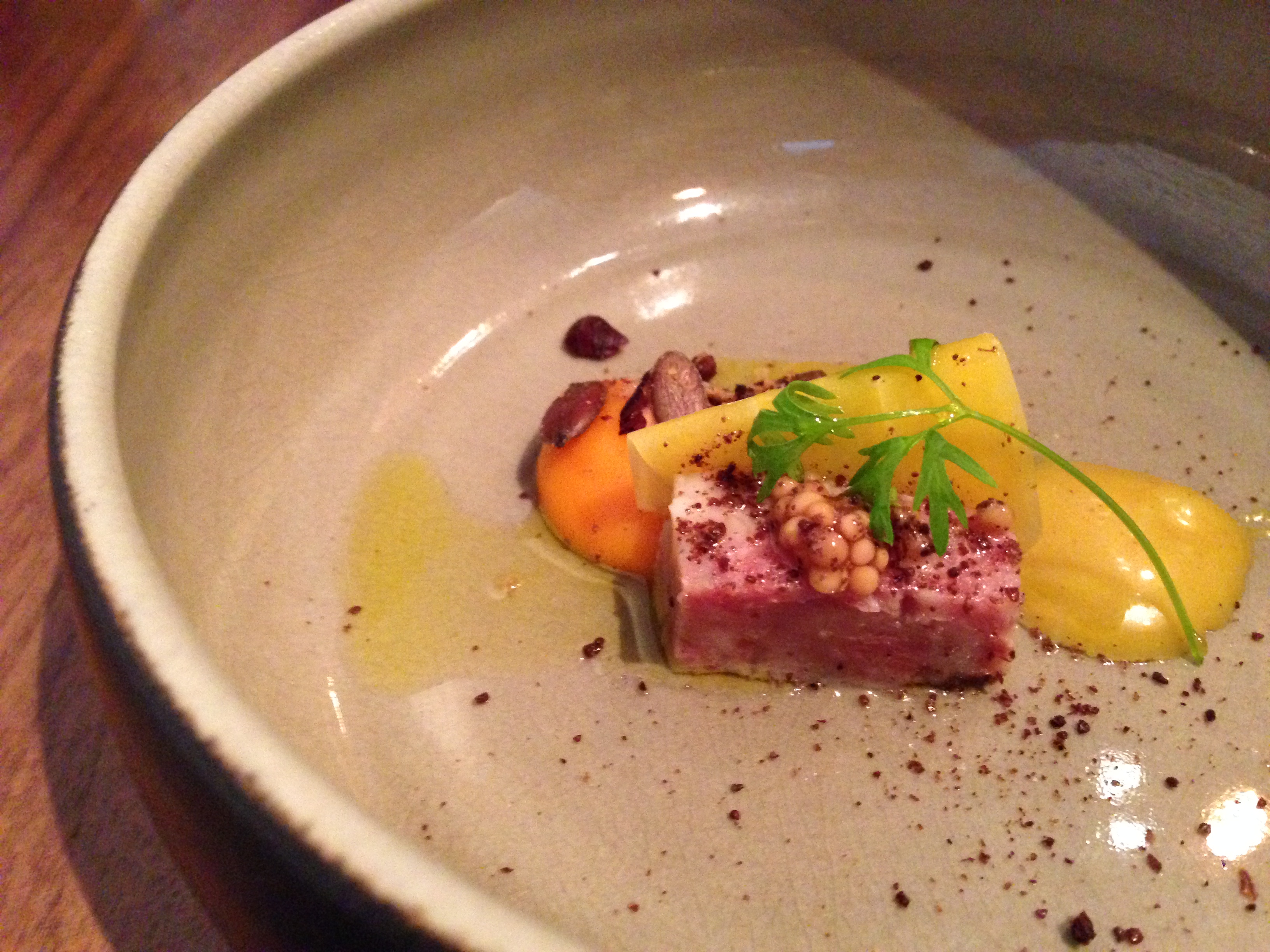 Eens die drankkaart plaats ruimt, dienen ze onze hapjes op: een quinoatoastje met kokos en gerookte paling enerzijds, een stukje varkenspoot met pompoenpuree en -pitten, gele wortel en curry anderzijds. Deze amuses verklappen dat we in een sterrenzaak lunchen. Wanneer onze gin tonics bijna leeg zijn, komt een leuke man de geuze serveren. Ik vertel over mijn voorliefde voor dit bier en bevestig het proeven met “De max!” (ietwat informeel voor een Michelinster, tja). Hij antwoordt dat dat inderdaad zijn naam is. Grappig!