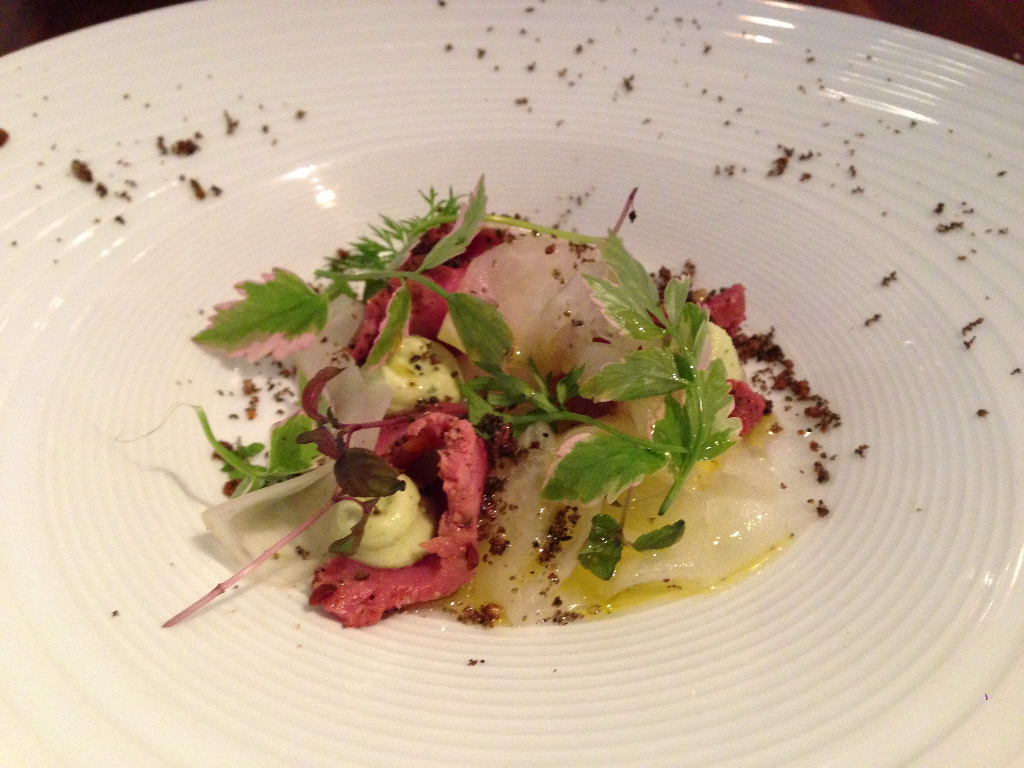 Als voorgerecht serveren ze deze middag tataki van hert met koolrabi. Origineel! Hoewel ik bij het declameren van het menu even ontgoocheld ben geen vis te horen, valt dit streepje wild echt wel in de smaak. Het gerecht oogt en proeft fris, ook door de nodige groene blaadjes. De ontbrekende Zesta madam meldt nog via een sociaal kanaal dat dit en ook de andere borden er mooi uitzien door onder andere die kruimeltjes. Spot on.