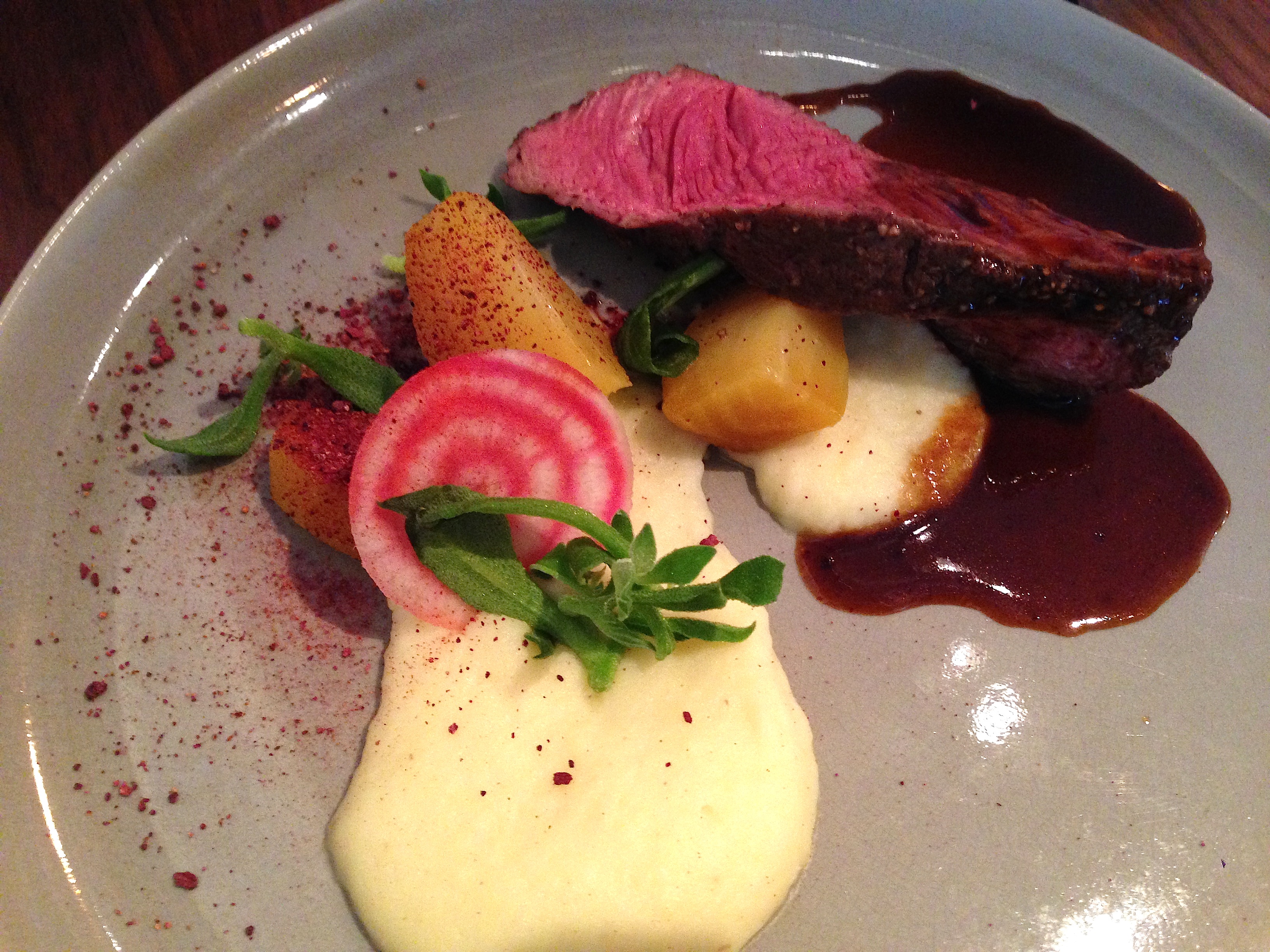 Bij het volgende bord kijken we in eerste instantie verwonderd door de vrij grote portie rundsvlees. Niet dat we hiermee alleen al de waarschuwing van de Hoge Gezondheidsraad (maximaal 500 gram rood vlees per week) in de wind slaan, maar we zijn alvast goed op weg! Voor ons staat dus rund met karnemelkstovers (wellicht noemen ze dat anders in Antwerpen – puree, eerder mousseline met karnemelk in plaats van melk dus), gele biet en jus natuur. Verder heb ik even opgezocht wat de precieze benaming van die prachtige wit-rood concentrisch gestreepte biet is: Chioggia, afkomstig uit Italië. Beiden vallen we met veel zin dat mooie vlees aan. We genieten van het royale rund, de fluwelen mousseline, de beetgare biet en de volle jus. Nu maar hopen dat het dessert even op zich zal laten wachten…