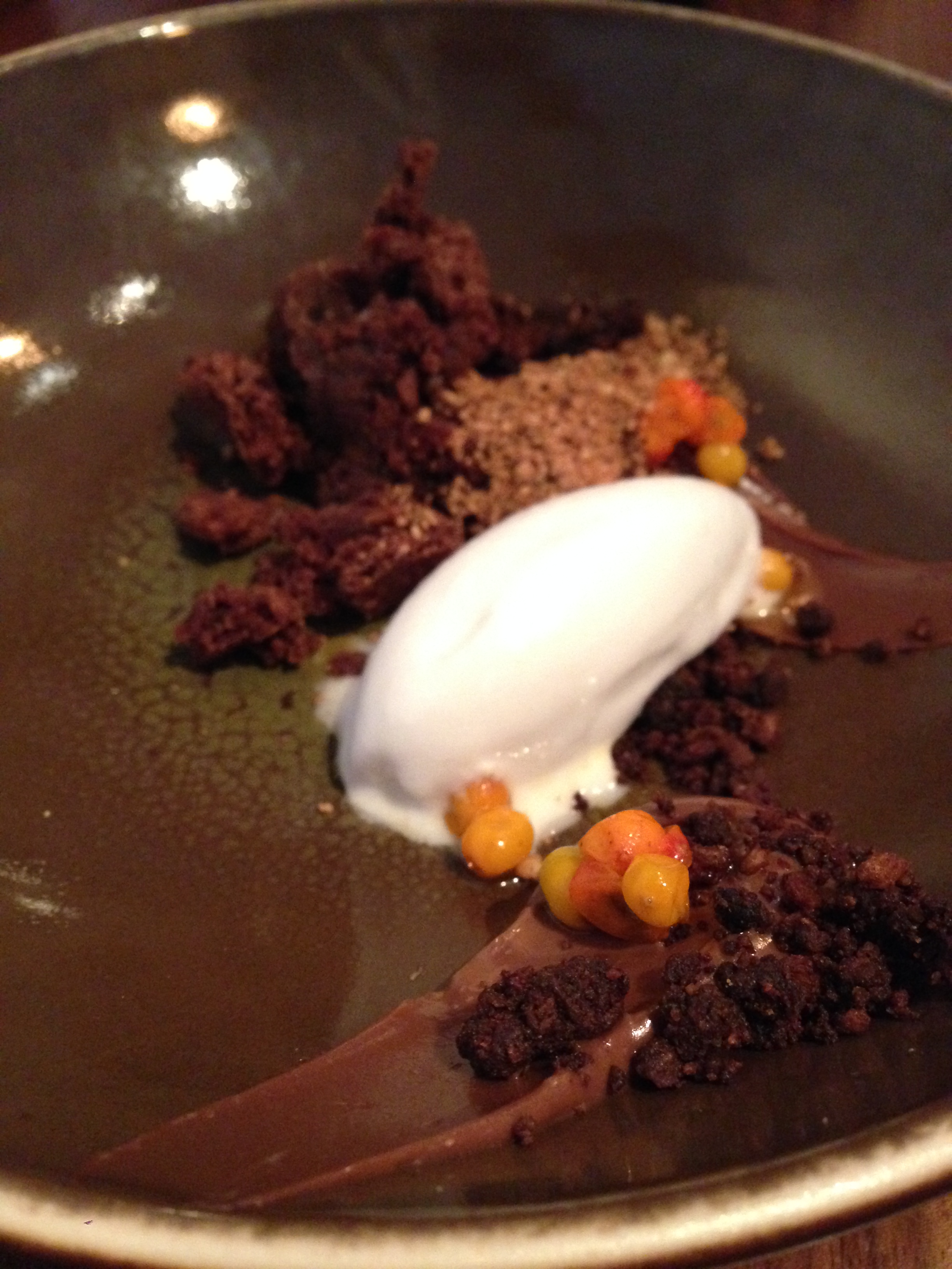 De presentatie van het nagerecht met chocolade, duindoornbes en kokos spreekt mij meteen aan. Ik denk aan een soort landschap, opgebouwd uit ganache, verkruimelde chocoladetaart en een crumble (van zandkoekjes of zo). Mijn tafelgenote weet overigens te vertellen dat één zo’n duindoornbes meer vitamines bevat dan een mandarijn. Zotjes!