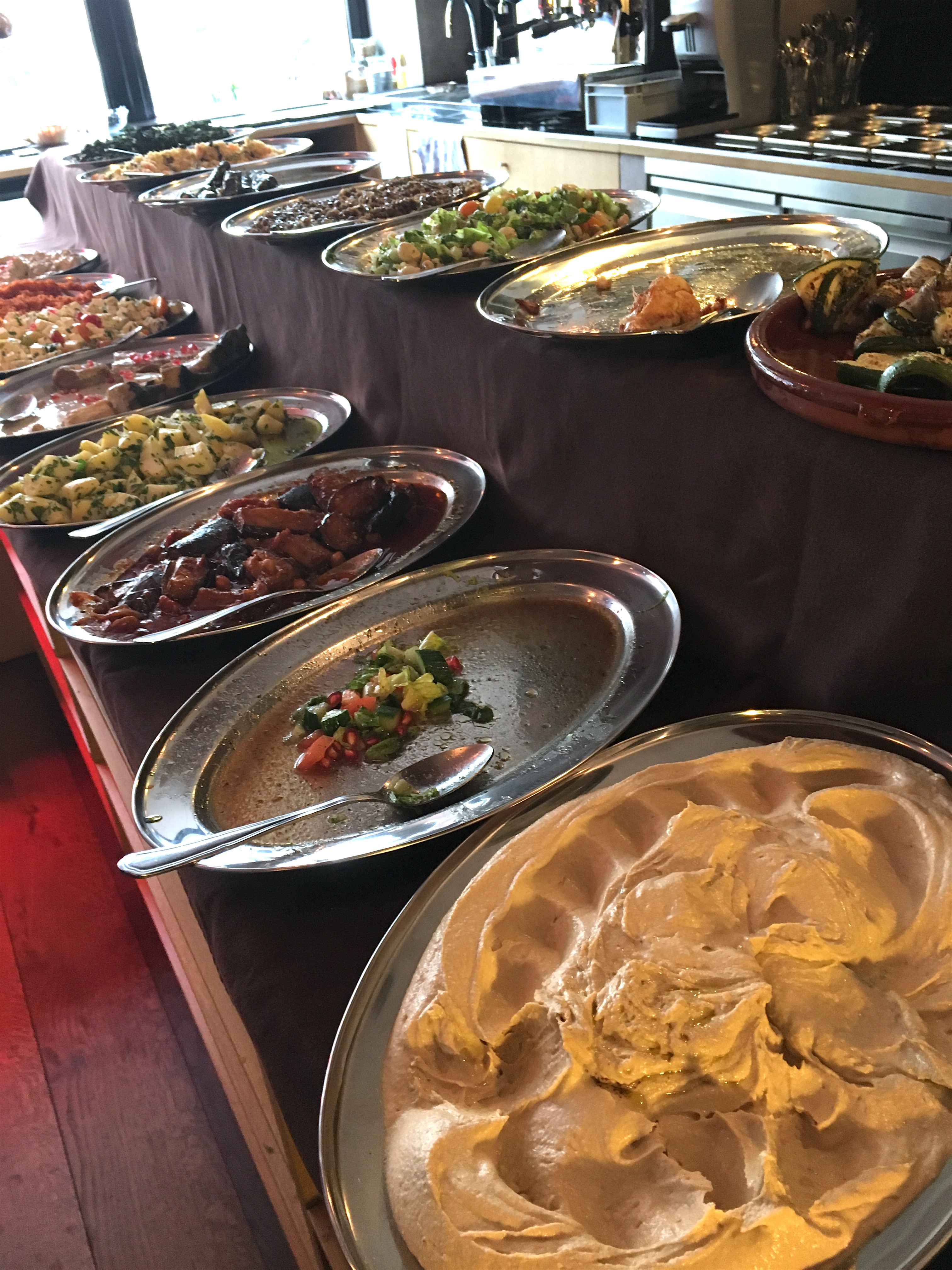 Het buffet bestaat uit een koud gedeelte (foto hierboven) met een vijftiental schalen boordevol lekkers. Verder worden nog een vijftal warme schotels op temperatuur gehouden onder van die typische rode warmhoudlampen. Bij middenoosterse keuken denk je automatisch aan aubergine, granaatappel en hummus. En inderdaad, deze en de aubergine in het bijzonder zijn prominent aanwezig… Allemaal van die heerlijk gepofte exemplaren die – zij het warm, zij het koud – smelten in de mond.