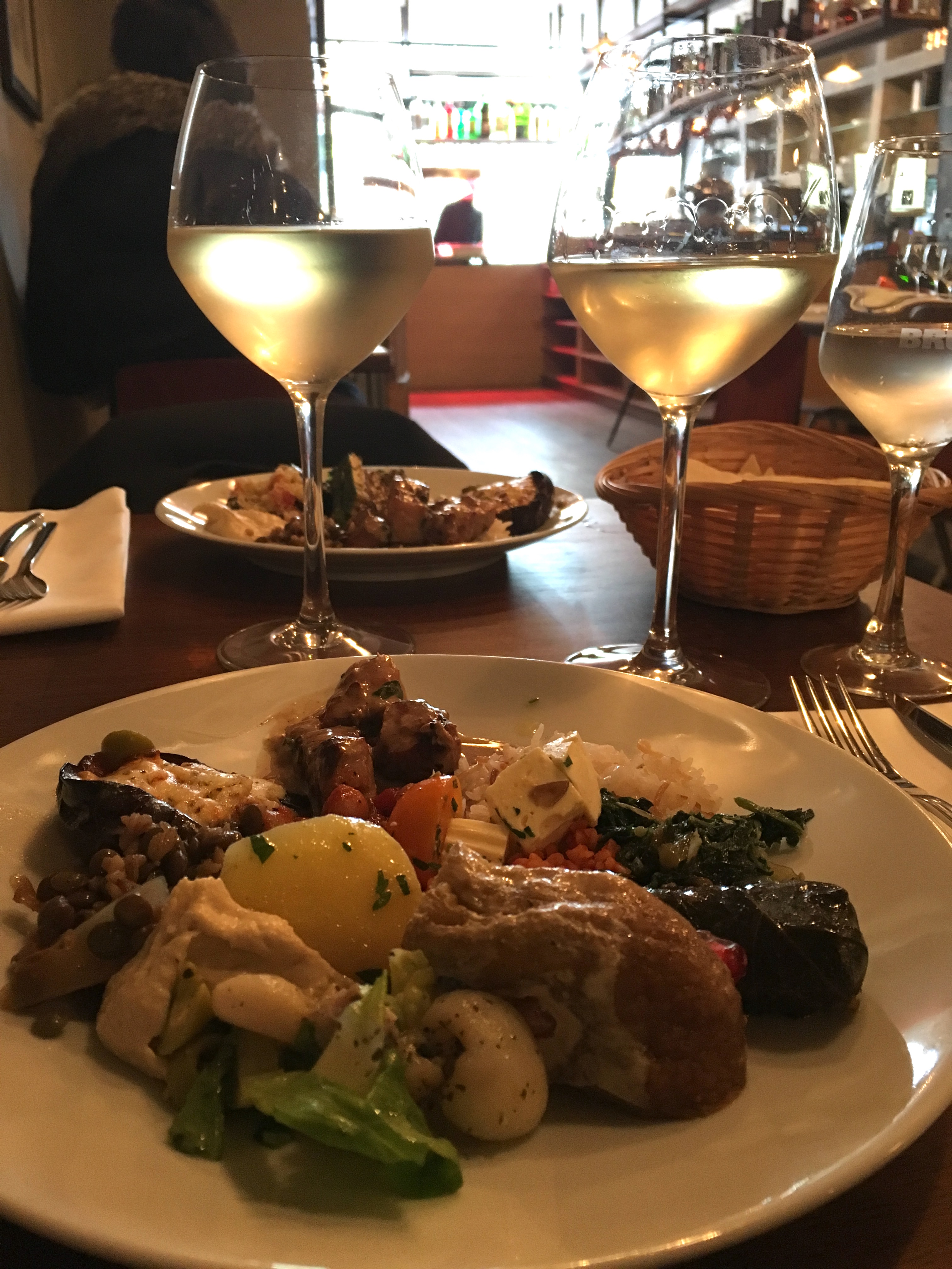 De atmosfeer bevalt mij meteen: eigentijds, gemoedelijk en vanzelfsprekend een tikje middenoosters. Tijdens het wachten op mijn gezelschap – met een tilt slaande GPS – komt een attente dame informeren of ik al iets wil drinken. Dat wil ik: graag een glas witte wijn.