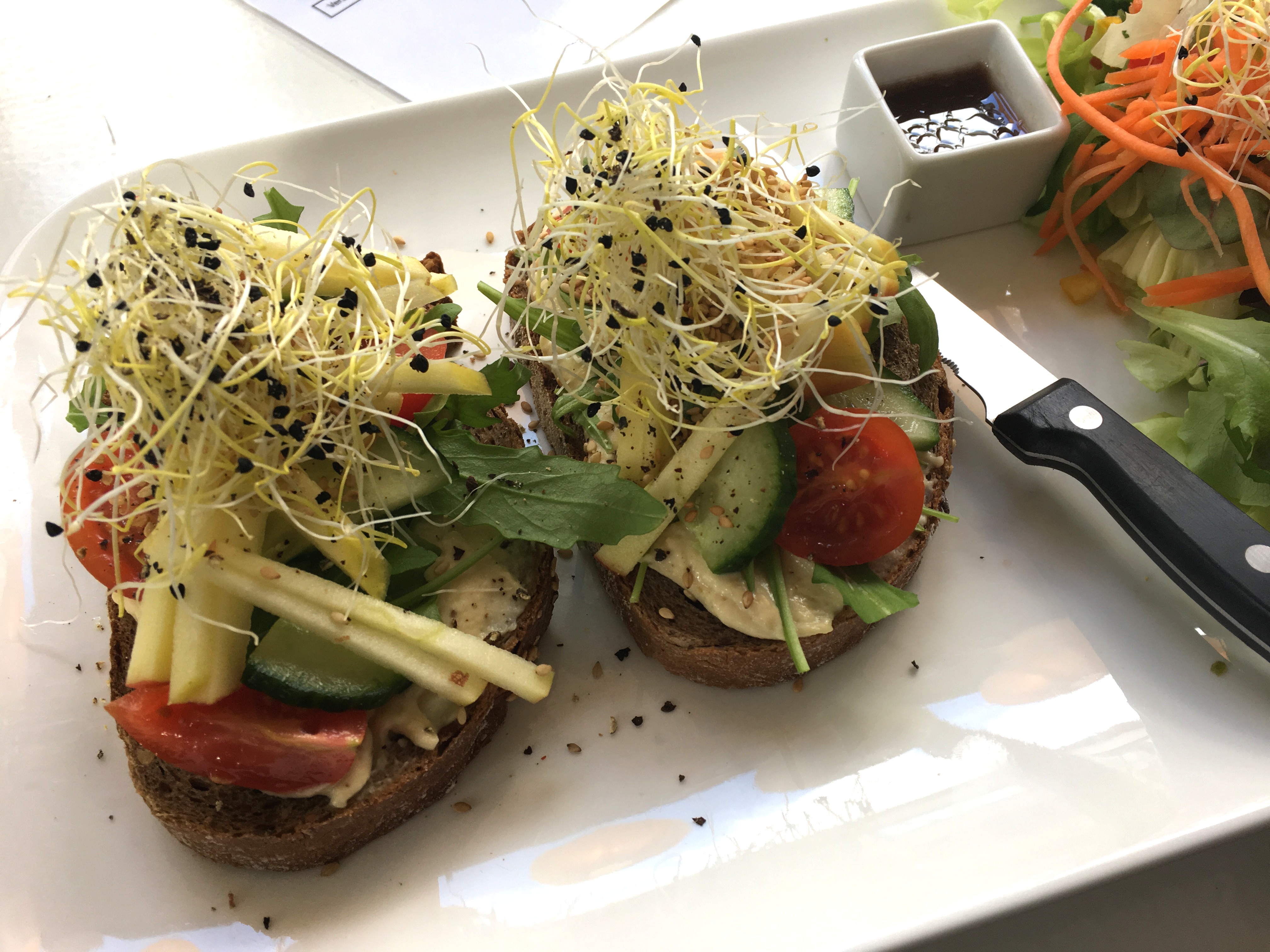 Aan de zijkant ligt verse rauwkost die besprenkeld mag worden met een vinaigrette in een vierkant potje. Met smaak eet ik mijn boterhammen op. Zo is het niet moeilijk om mee te doen aan Dagen Zonder Vlees! Ik neem ook dit broodbeleg als inspiratie mee naar huis.