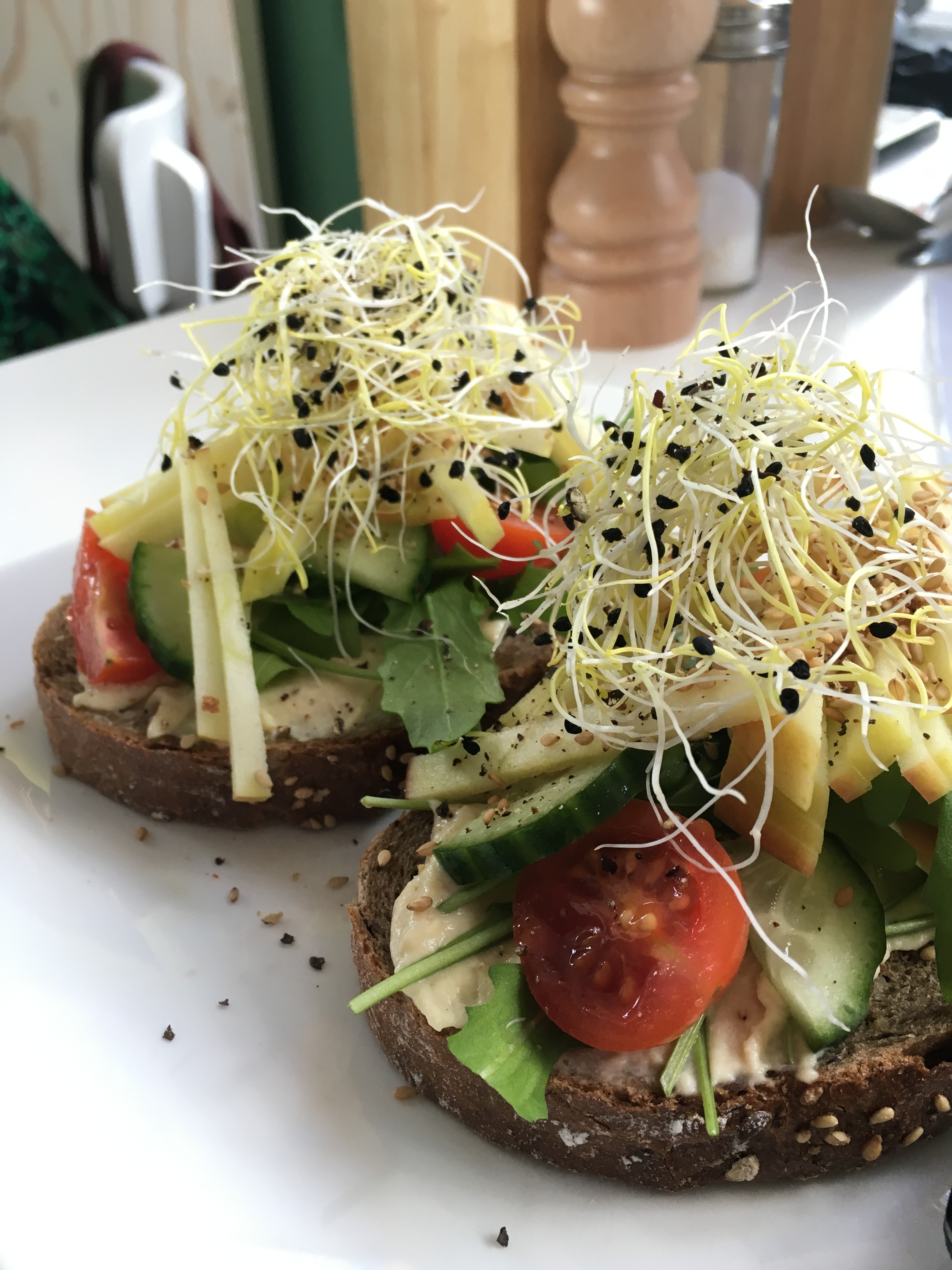 Ik doe mee aan Dagen Zonder Vlees, dus speur ik naar de vegetarische opties op de kaart. Zou ik voor de vegetarische spaghetti (€ 13) kiezen of een salade met mozzarella (€ 14)? Uiteindelijk wordt het de waterkers-spinaziesoep (€ 4,50) van op het krijtbord en een boterham met hummus, rucola, kerstomaten, komkommer, appel, preischeuten, sesam (€ 8). Met een BOS ginger & lime (€ 2,40).