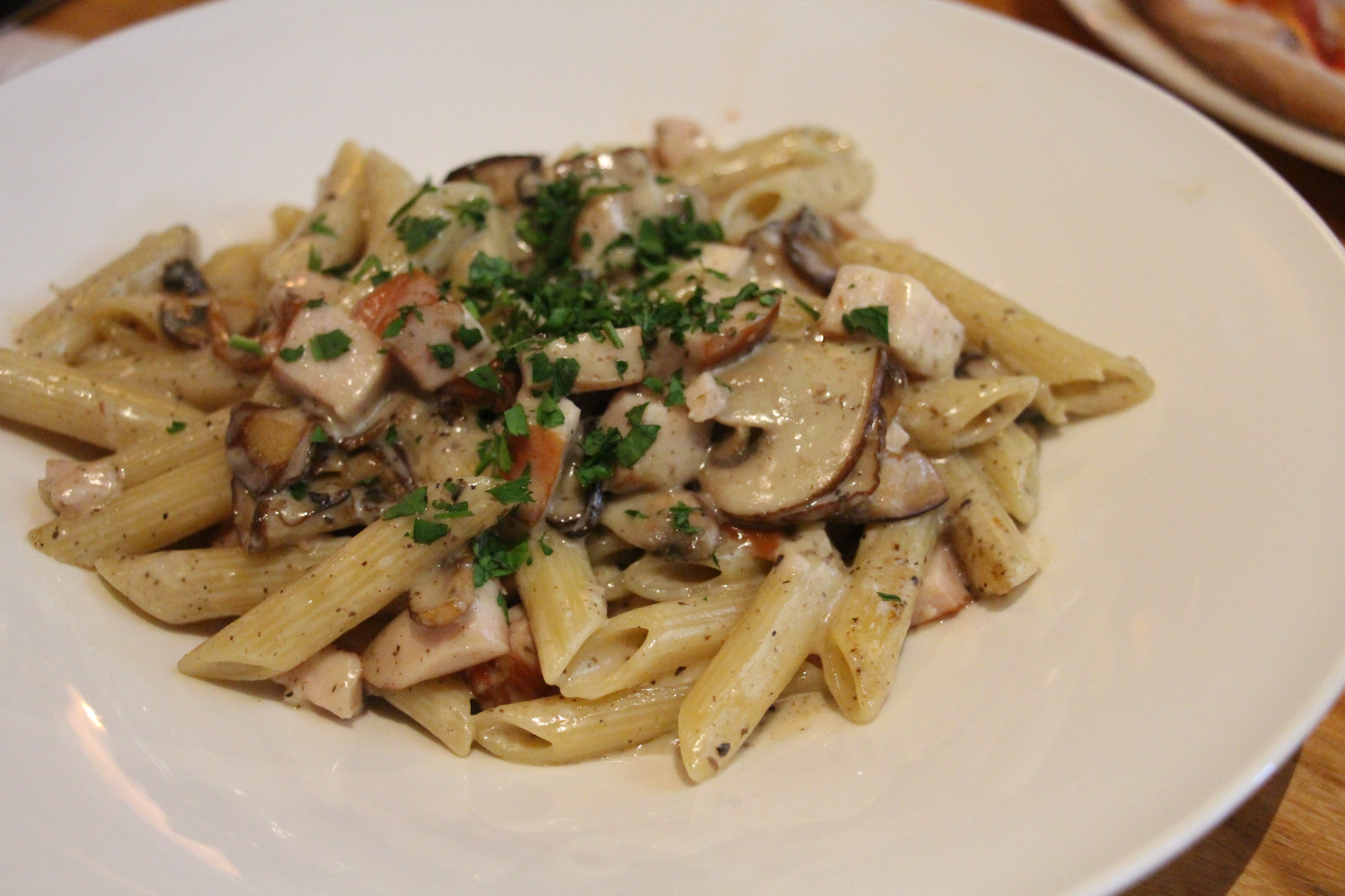 Mijn gezelschap verkiest de pizza parma en de penne met gerookte kip en funghi, waarvan ik de prijzen vergeten ben. Bij beiden geen klachten, behalve dat de portie misschien net iets te ruim is. En mijn meneer vindt kerstomaten op een pizza parma maar niets. Wanneer hij trouwens om pikante olie vraagt (iets vrij standaard in Belgische pizzeria’s), duurt het wachten opnieuw erg lang. Even later blijkt waarom: ze hebben die pikante olie à la minute bereid en dat proef je blijkbaar – positief bedoeld!