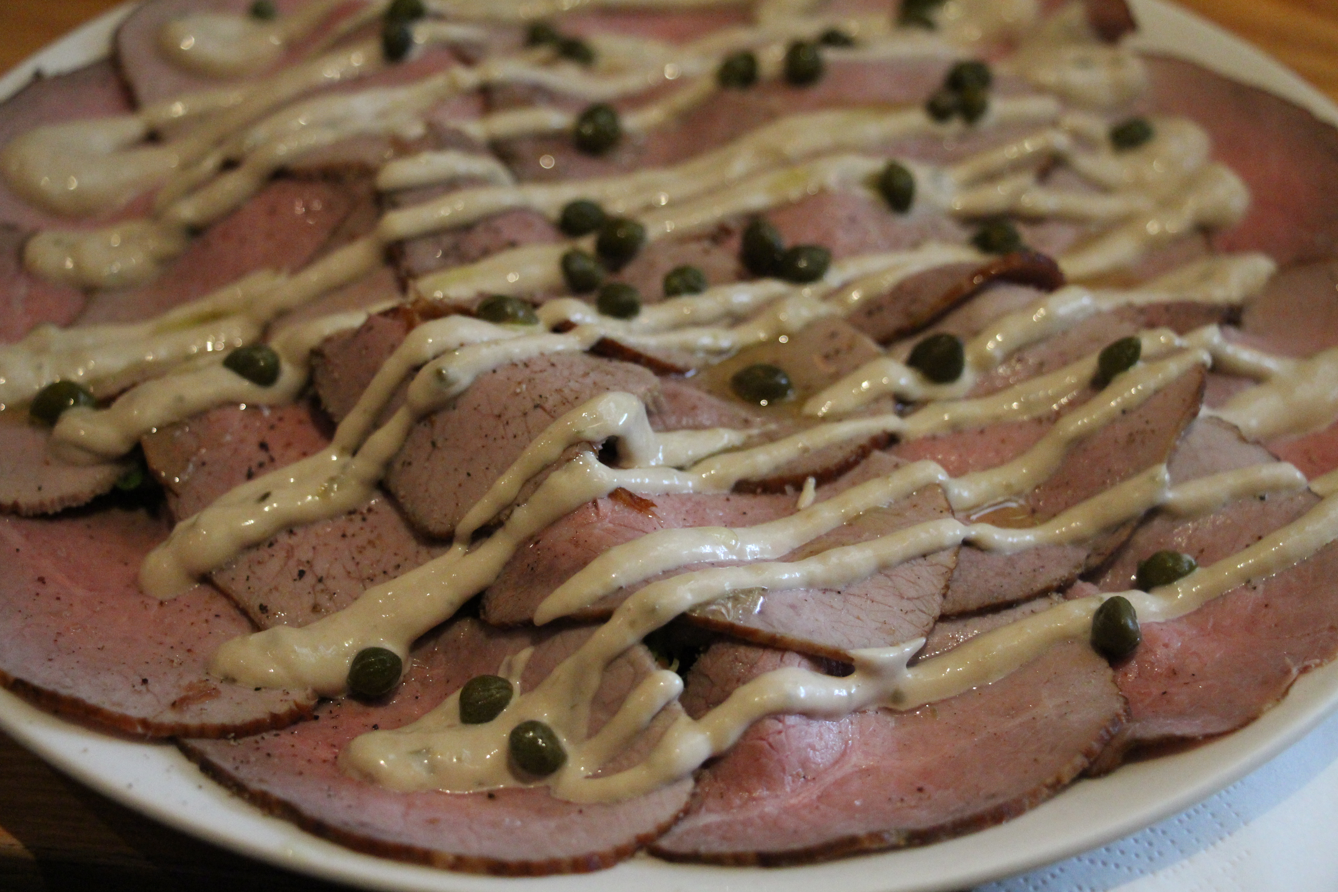 Na een klein uurtje verschijnen onze bestellingen dan toch. Voor mij komt een ruim bord met dunne sneetjes gebakken kalfsvlees te staan. Onder de sneetjes ligt wat sla, bovenaan de typische tonijnmayonaise met kappertjes. Een perfecte lunch, wat mij betreft!