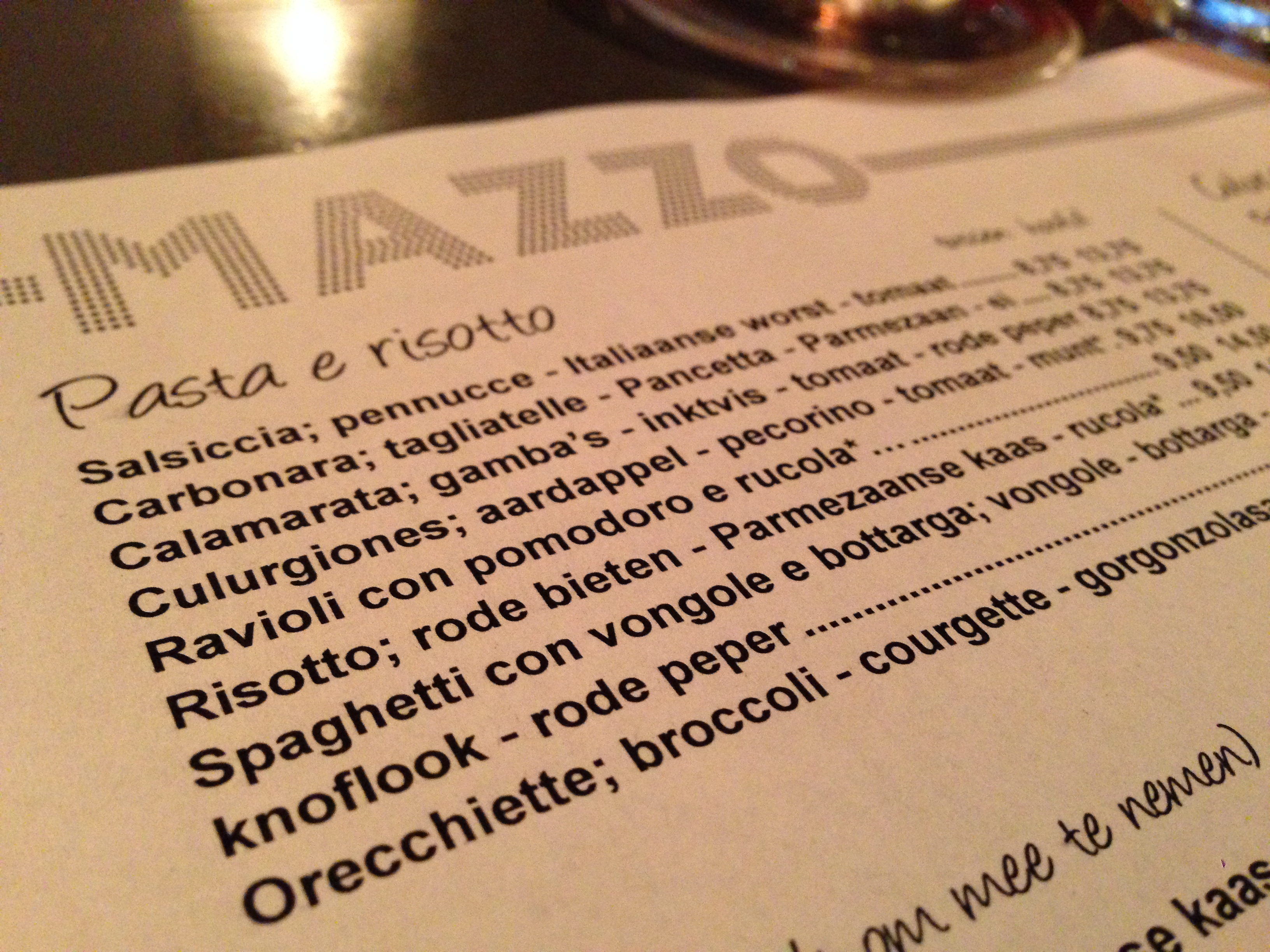 De eerste avond in Amsterdam probeer ik rond 19u00 naar een Italiaanse vermelding in de Where Chefs Eat app te bellen: MAZZO op de Rozengracht. Ik ben te laat, maar maak van de telefoonverbinding alvast gebruik om de volgende dag te reserveren…