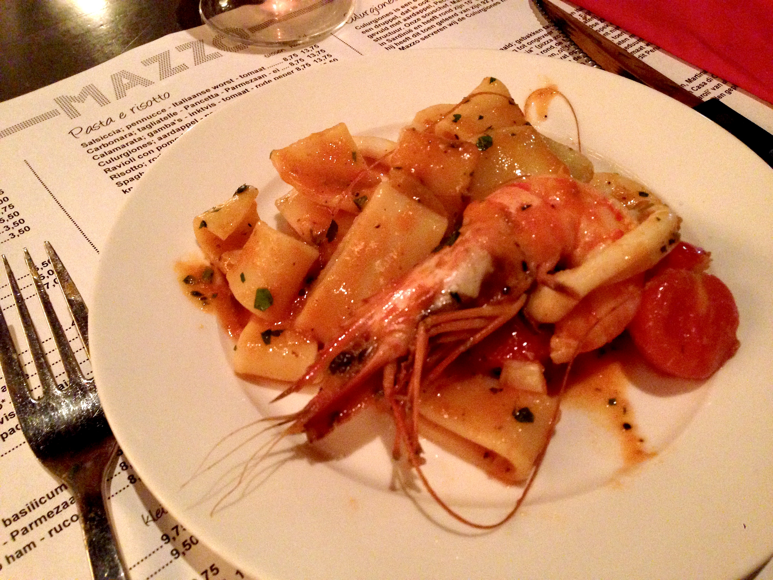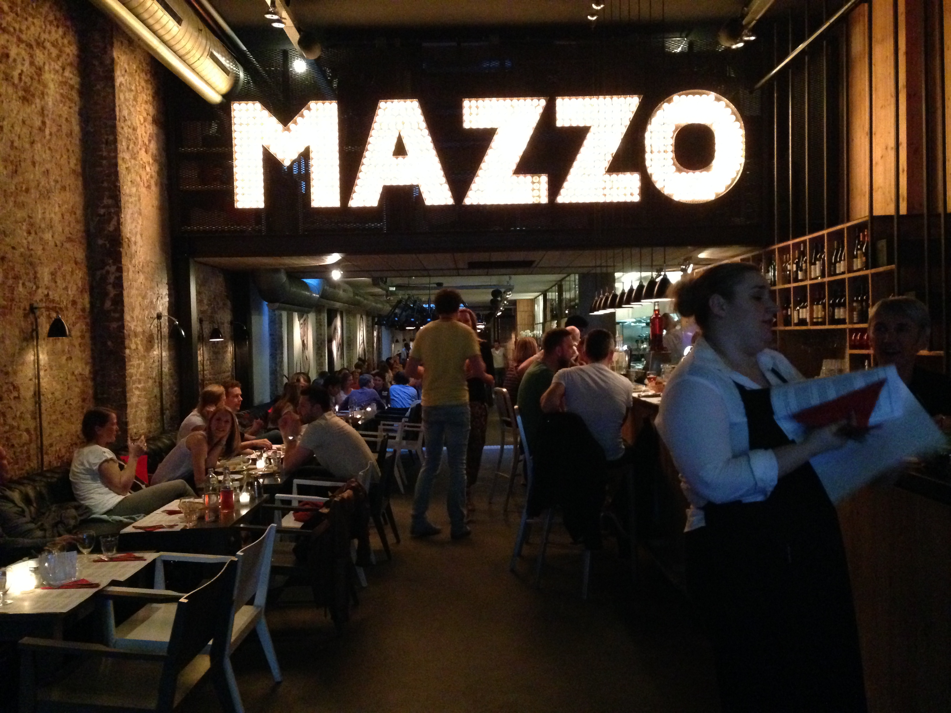 Op de avond voor Koningsdag wandelen we tegen 20u00 dit indrukwekkende pand binnen. Buiten zit een beperkt terras vrij vol, bij de ingang staan links nogal wat hoge tafels met barkrukken en rechts lage tafels met zetels. Het tweede deel van het grote restaurant zit inmiddels volledig vol. En het geheel maakt wel degelijk indruk: de lampen vlak voor je die in vette letters MAZZO vormen, de houten wand tot aan het plafond opgevuld met Italiaanse producten, de moderne lusters die ik de avond voordien in het Stedelijk Museum ook op de Marcel Wanders expo opmerkte.