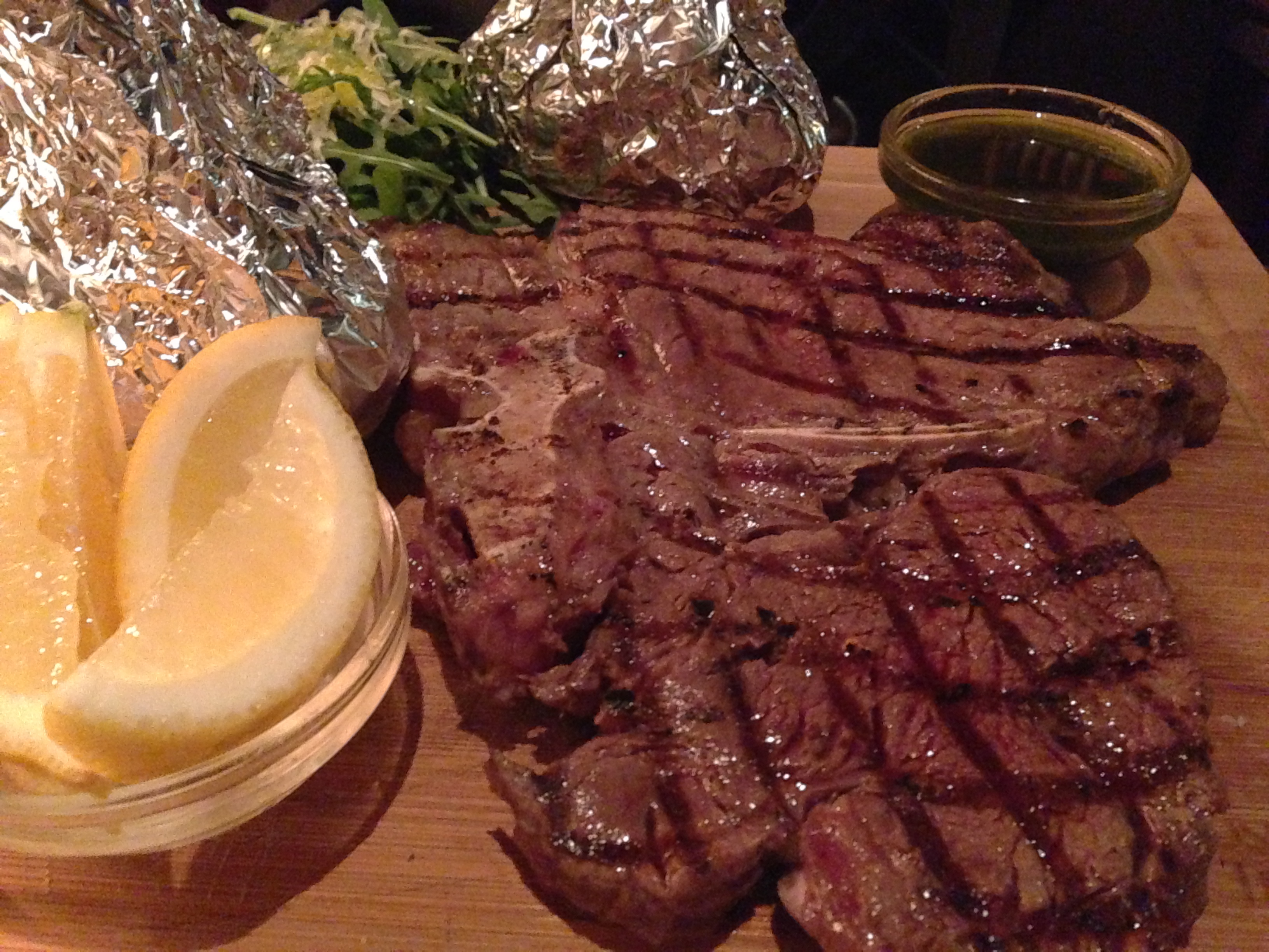 Even later komt onze plank tevoorschijn met daarop het gegrilde – zelfs gequadrilleerde – vlees, een paar partjes citroen, een potje met pestodressing, twee aardappelen in aluminiumfolie en rucola. We verdelen de buit over onze borden, maar laten de citroen voor wat het is. Het vlees bevalt veel beter dan mijn vooroordeel influisterde: erg mals en vol van smaak. De pesto maakt niet bijzonder veel indruk. Het gehele gerecht met vlees, aardappel en raketsla heeft uiteindelijk iets eenvoudigs dat mij wel aanstaat.