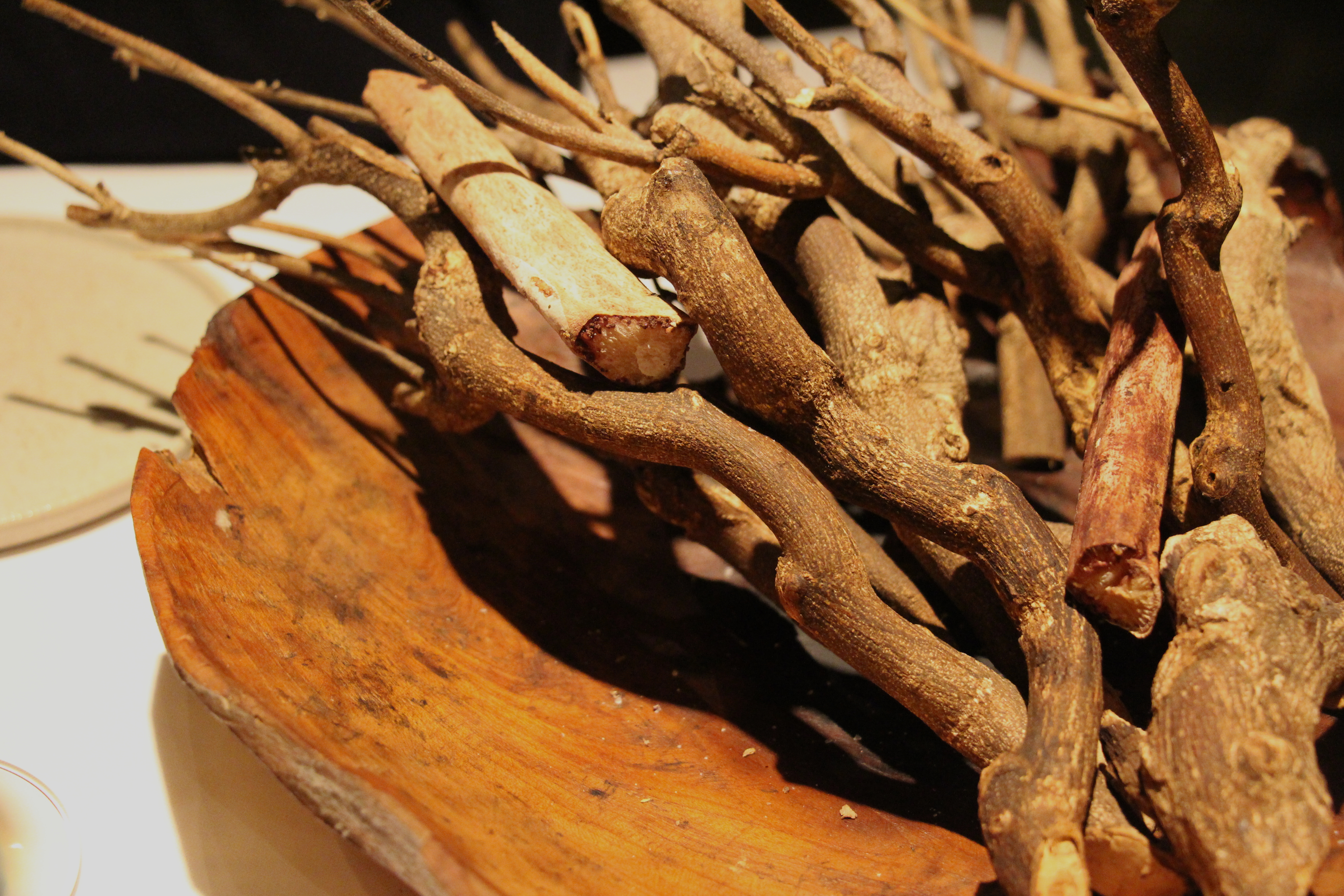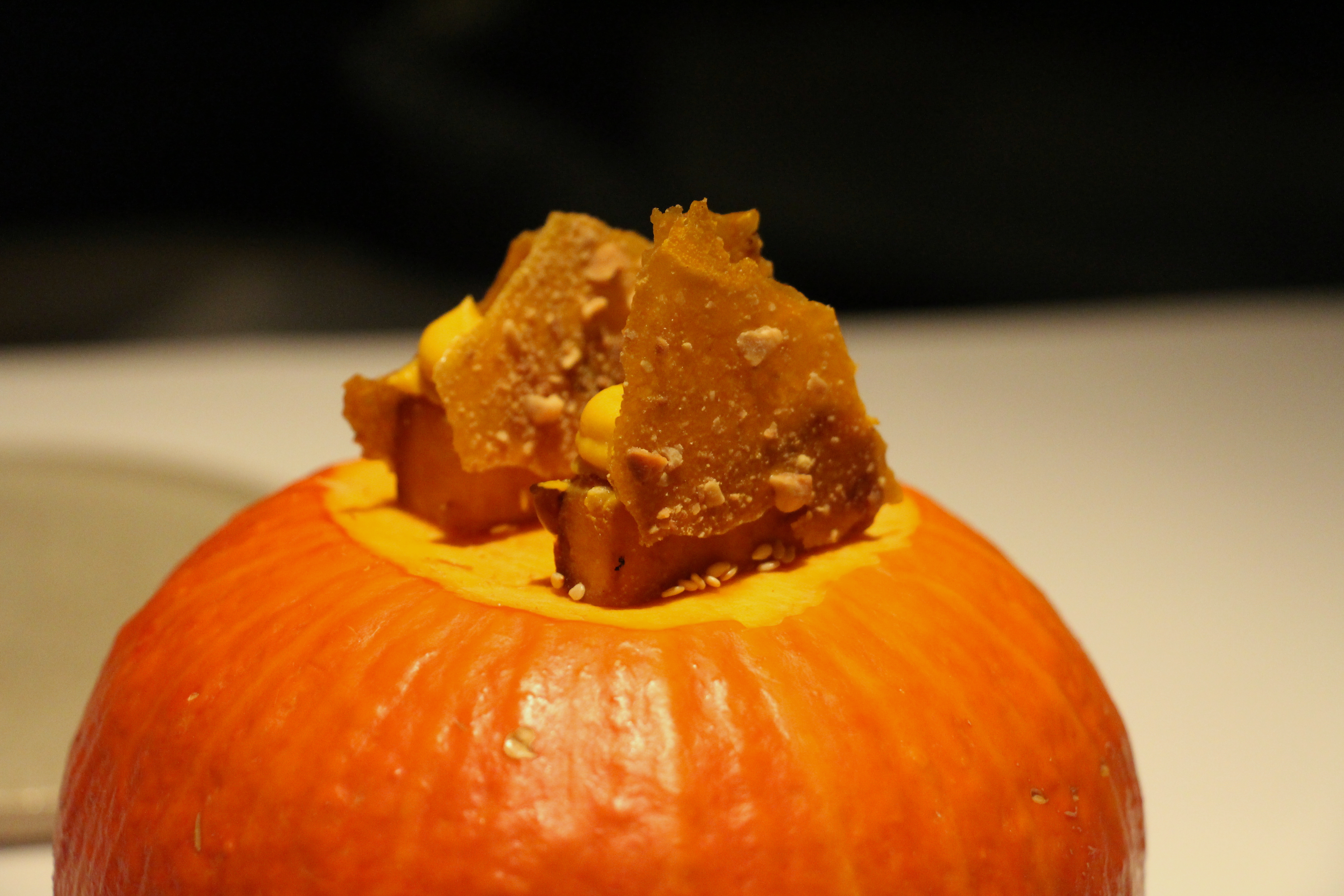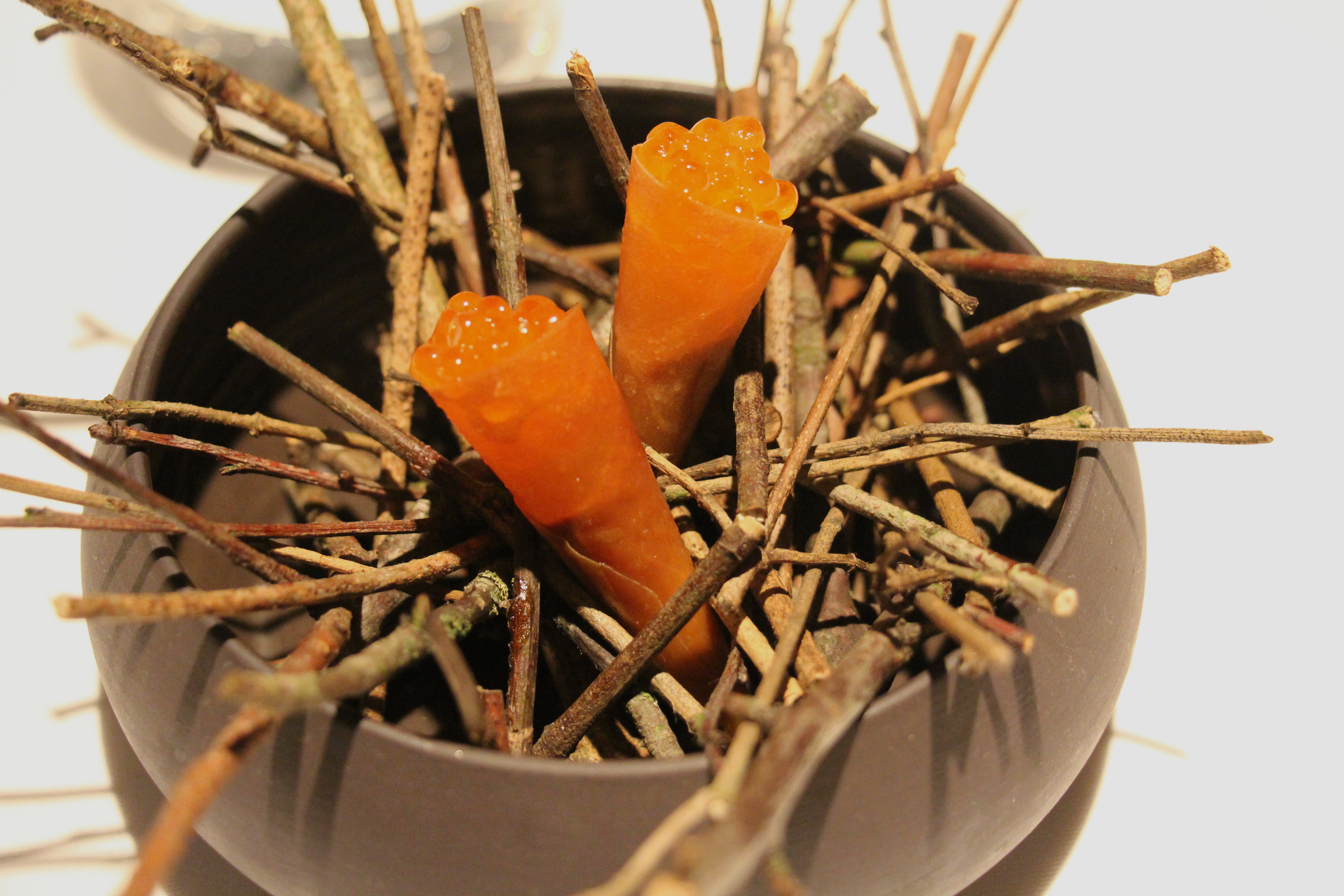 Het kaaskoekje komt dus iets te snel voorbij om echt indruk te maken. We wachten om onze mond te laten openvallen tot aan de schaal met takken waar we gevraagd worden om de schorseneer te zoeken… Leuk! En lekker, zo gedipt in crème fraîche met daslook. Ook het pompoenhapje en de cornet krijgen een gepaste decor om te schitteren. En bij die laatste hoort uiteraard een grapje…
