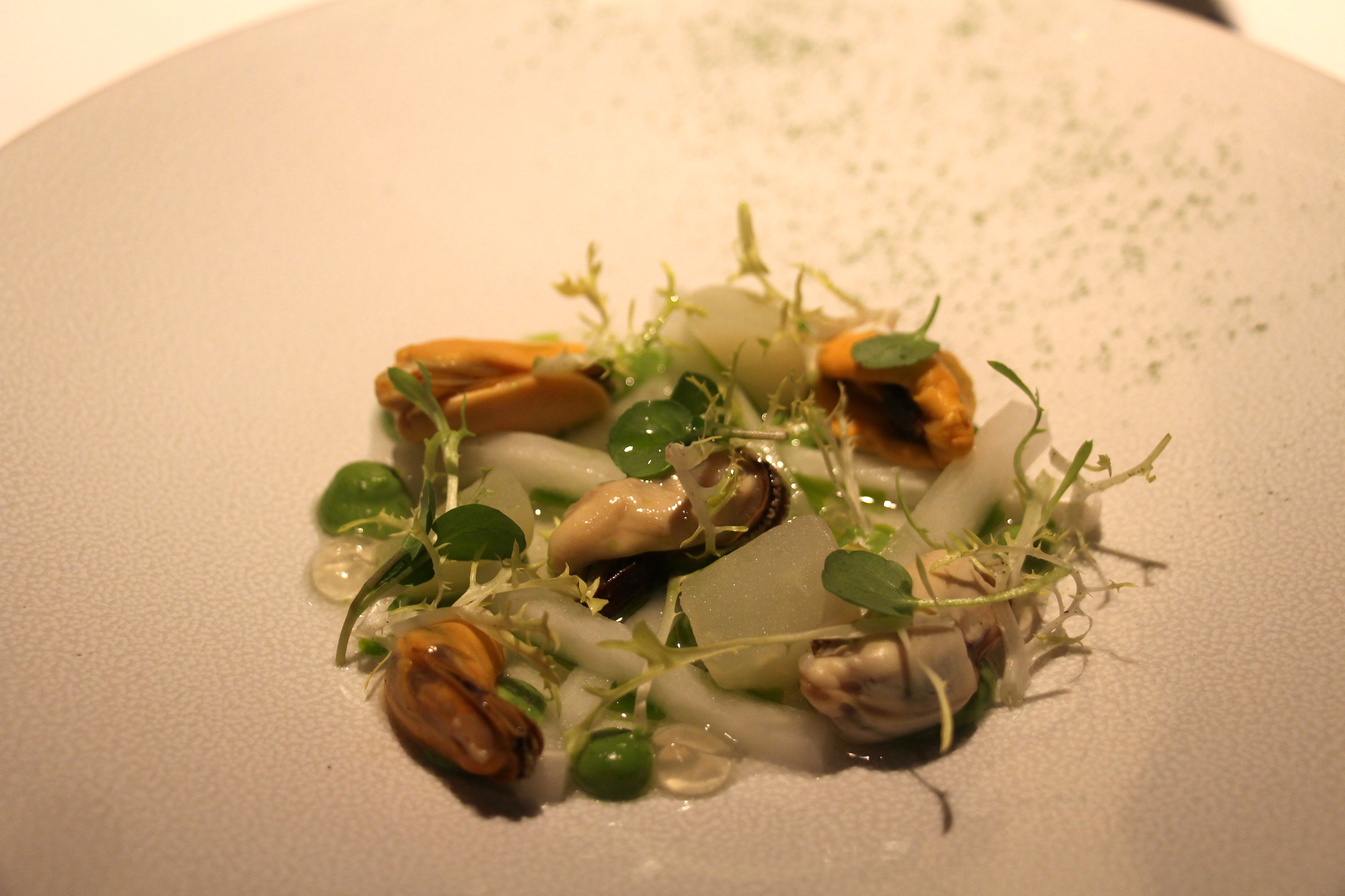 Wijngewijs starten we met een Grüner Veltliner van Tom Dockner, een Oostenrijks wijnhuis. De sommelier vertelt telkens op heel charmante wijze waarom hij deze bepaalde wijn combineert met het geserveerde gerecht; we hangen echt aan zijn lippen. Naast oesters is Zeeland uiteraard ook mosselland, dus we proeven van een streekproduct. De zilte mossel met z’n zachte smaak wordt boeiend tegengesproken door het zurige van de gefermenteerde rettich (bij ons rammenas genoemd).