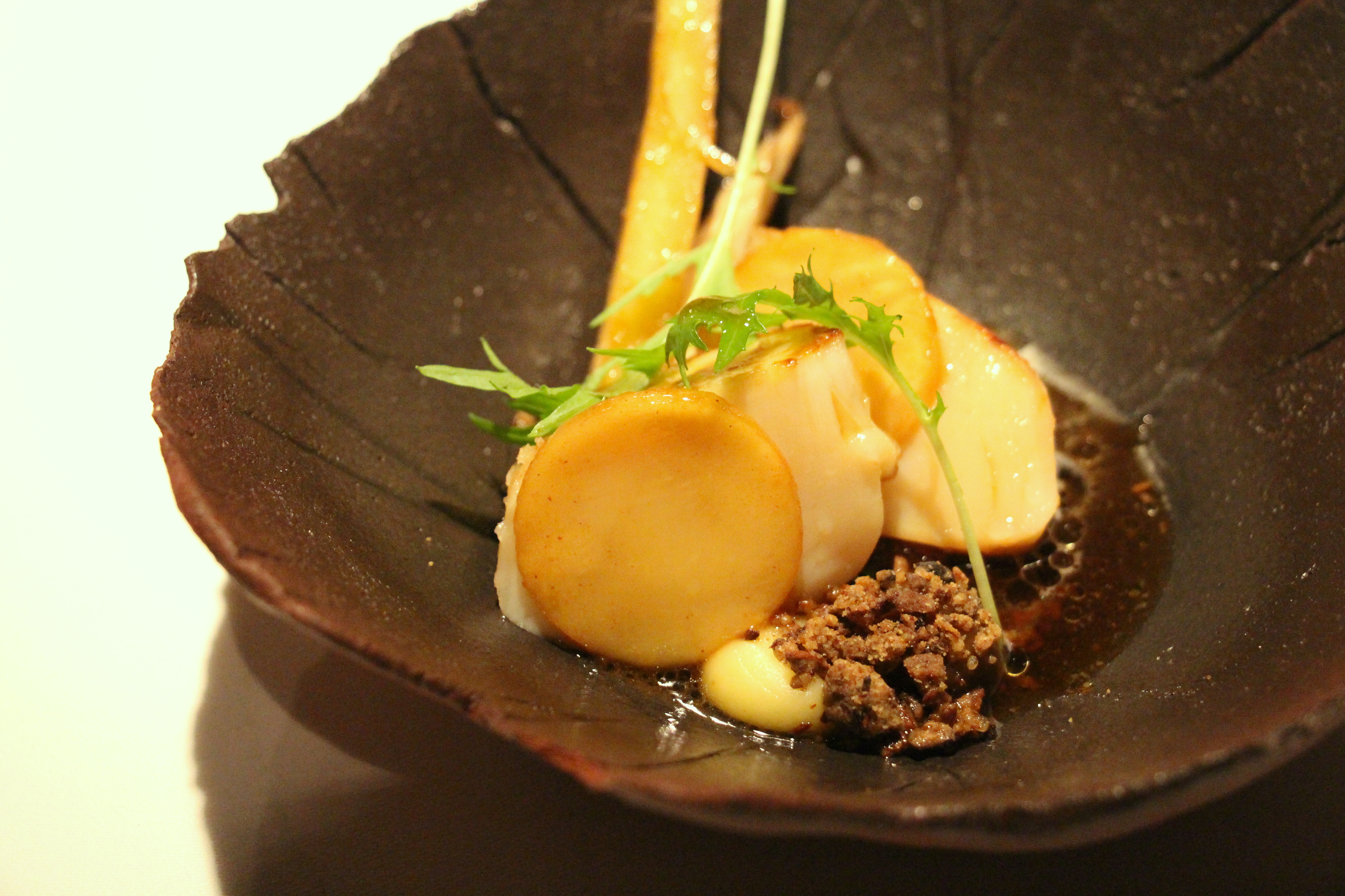 Geen gastronomisch menu zonder sint-jakobsvrucht(en) en dat is bij Meliefste niet anders. De kanjer van een coquille wordt gehalveerd geserveerd met enkele wintergroenten en crunch plus bouillon van eekhoorntjesbrood. Daarbij drinken we een witte Portugees waarvan enkel de naam Dona Ermelinda (op mijn logboek) bleef plakken. Absoluut een fijne gang met dito wijn, maar ik geniet eerlijk gezegd vooral nog na van de vorige… Zelfs over de keramiek ben ik minder enthousiast in vergelijking met een gang geleden.