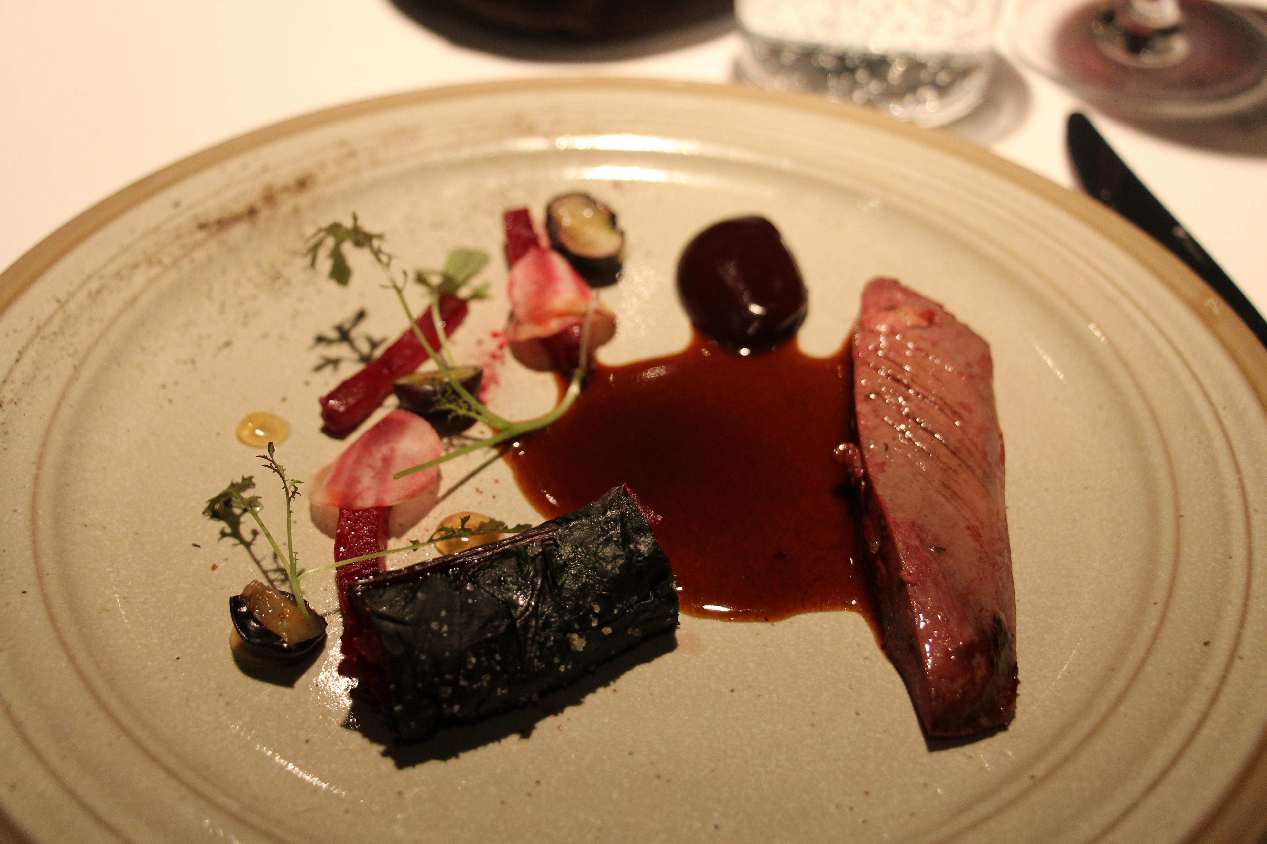 We ronden de hartige gerechten af met wilde eend en een kunstige compositie van bessen en bieten. Het stukje eend oogt wat atypisch zo zonder vel en duidelijk tevens eerder traag gegaard dan aangebakken. De smaak trekt elke criticaster echter over de streep. Herfst in je mond en die seizoenstoetsen mogen we blussen met een Zuid-Afrikaanse Cinsault van David & Nadia.