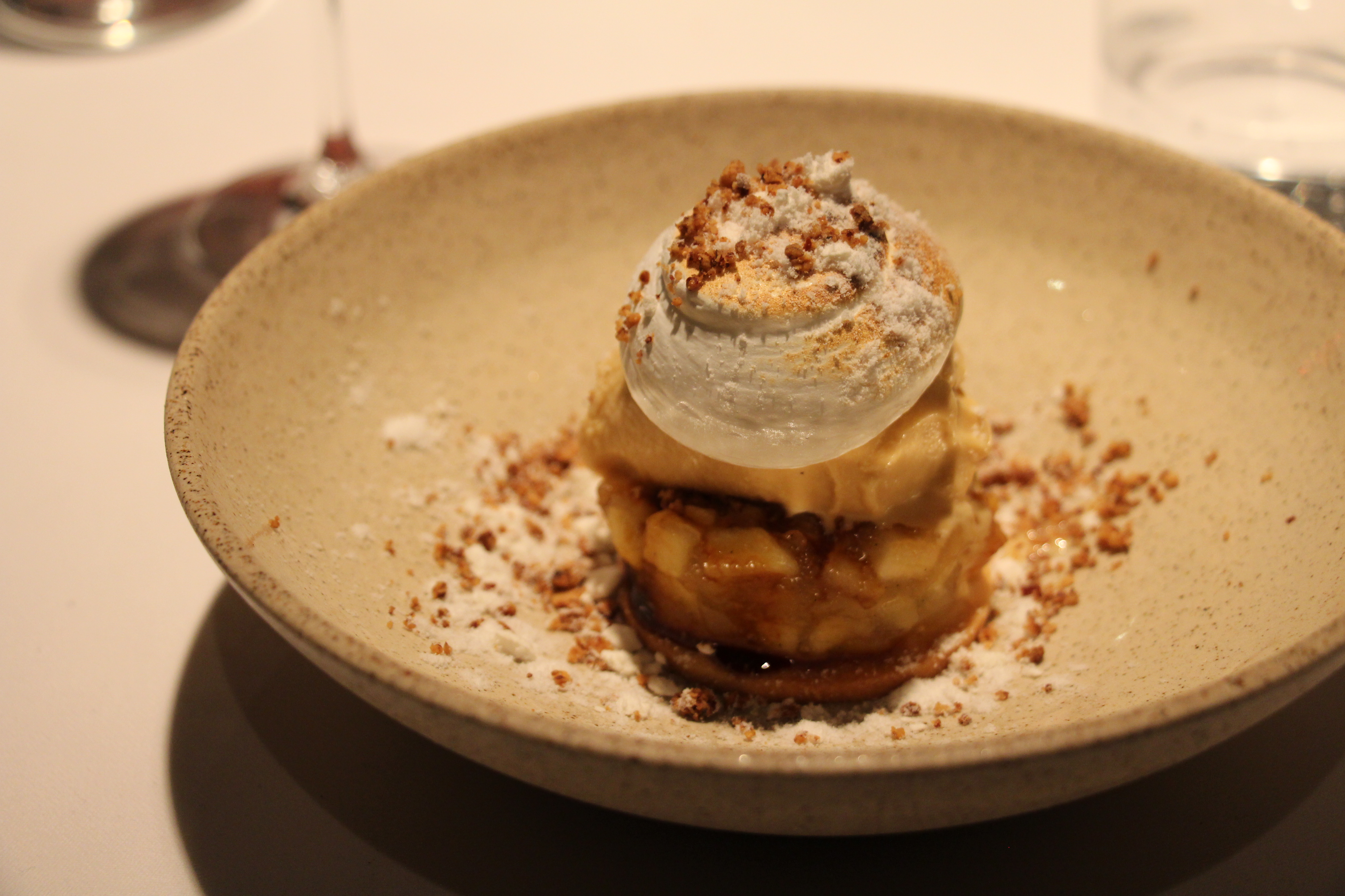 Bij het dessert ben ik vooral benieuwd naar die sprekende boerenjongens, dat blijken in alcohol gedrenkte rozijnen te zijn. Het samenspel met de appel klopt en ook de sherry (waarvan ik blijkbaar een foute naam noteerde of die onvindbaar is via Google) doet z’n duit in het zakje om deze gang te vervolledigen.